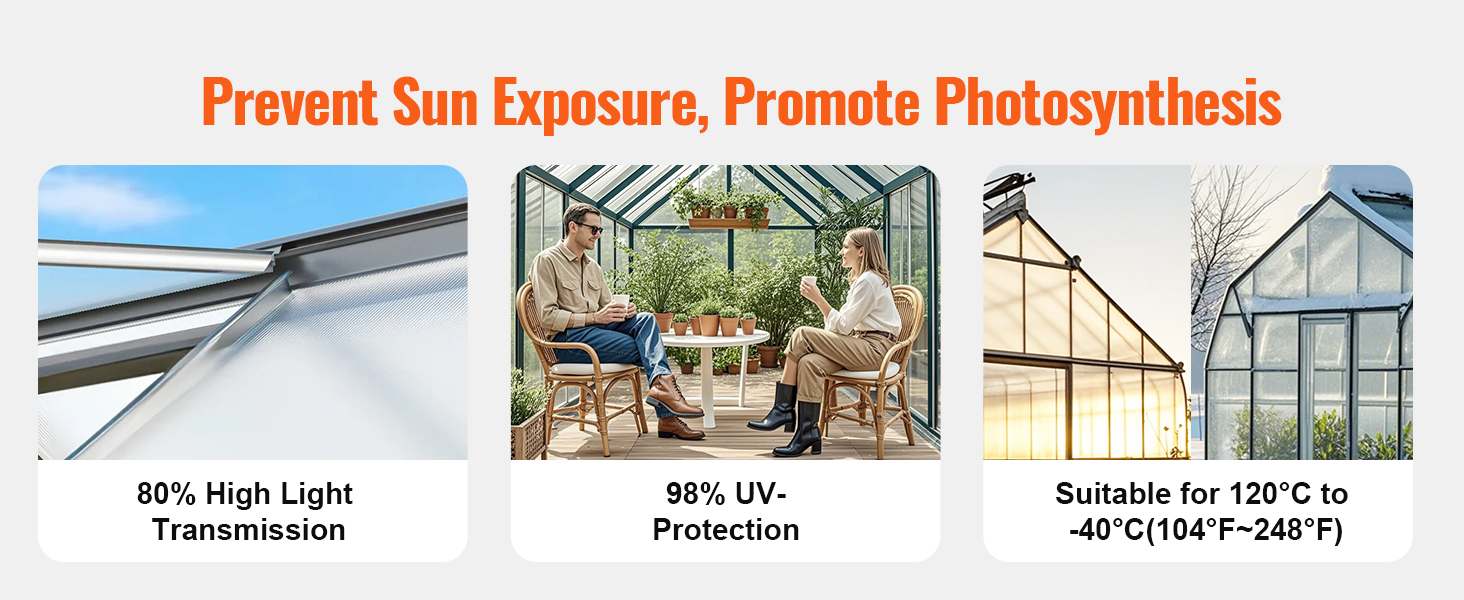 Vysoko priehľadný polykarbonát s UV ochranou poskytuje dostatok svetla, blokuje UV žiarenie a podporuje rast rastlín. Ľahko sa inštaluje, je prispôsobivý a energeticky účinný, poskytuje celoročnú izoláciu a bezpečnosť.