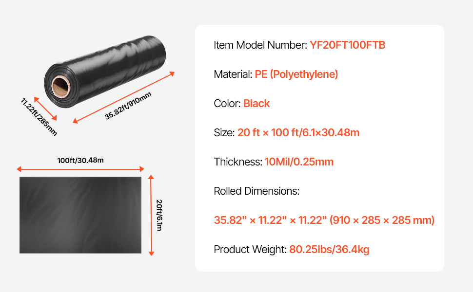 Táto plastová fólia s hrúbkou 10 milimetrov je odolná voči roztrhnutiu pri namáhaní. Jej veľké rozmery 20x100 stôp zabezpečujú široké pokrytie akéhokoľvek projektu. Čierna fólia účinne blokuje slnečné svetlo, aby sa zabránilo rastu buriny, a zároveň je odolná voči poveternostným podmienkam. Ideálna na kontrolu buriny, ochranu plotov, izoláciu.