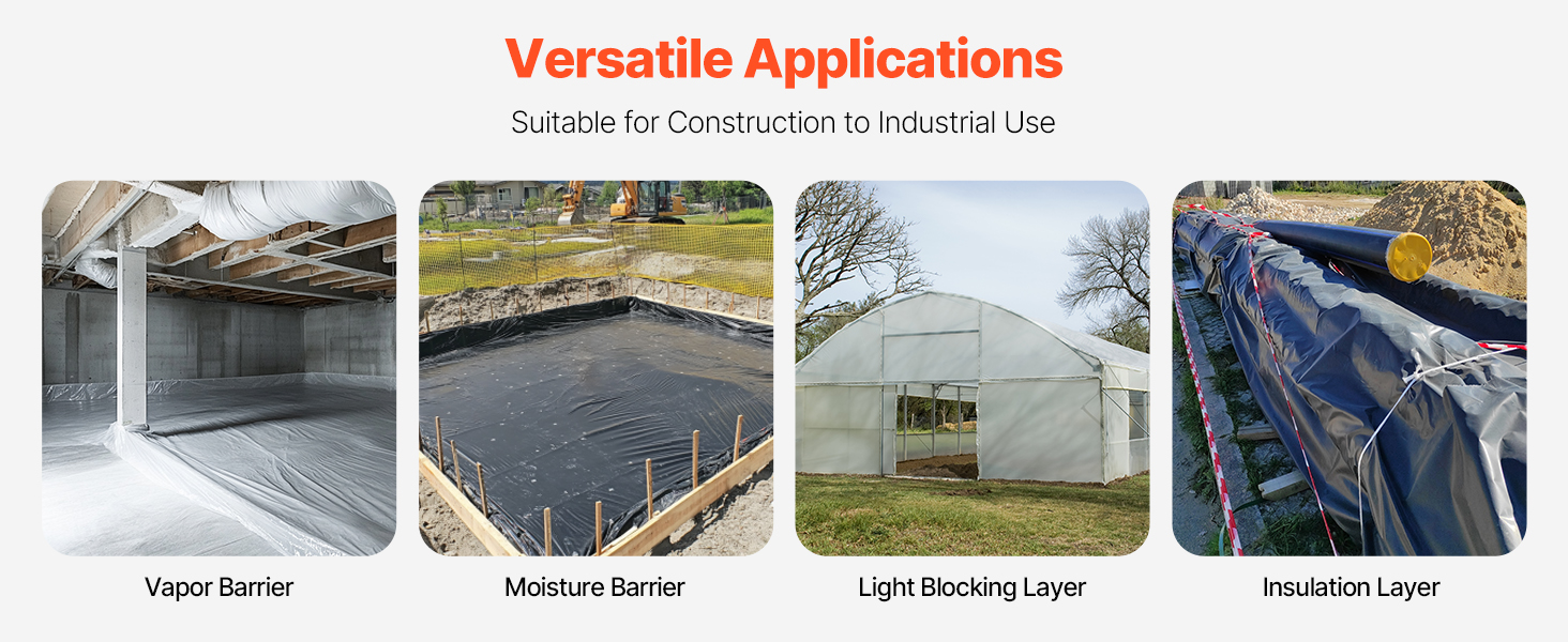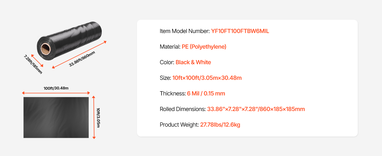 Táto plastová fólia s hrúbkou 6 milimetrov pre vysokú odolnosť proti roztrhnutiu a trvanlivosť. Veľkorozmerná plastová fólia s rozmermi 10 stôp x 100 stôp (3,05 m x 30,48 m) pokrýva rozsiahle plochy. Obojstranný čierno-biely dizajn na odrážanie svetla, blokovanie a reguláciu vlhkosti, ideálny pre potreby stavby.
