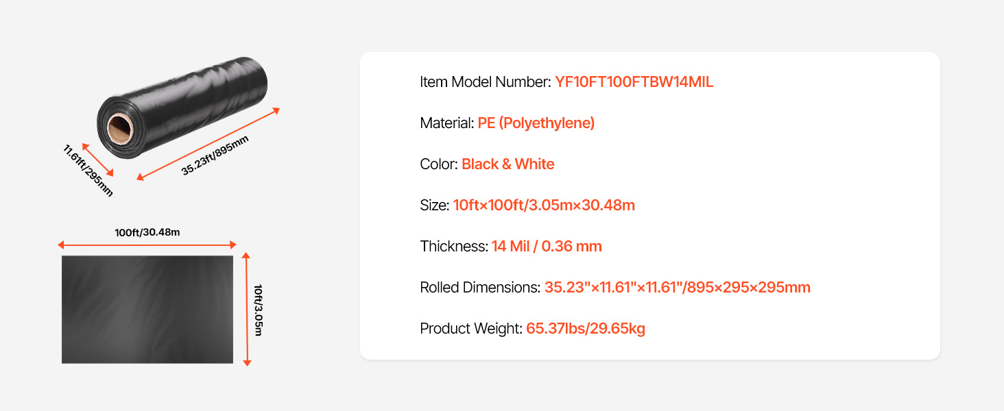 Táto 14mil/0,35mm hrubá fólia z ťažkého plastu pre odolnosť proti roztrhnutiu a trvanlivosť. Veľkorozmerná plastová fólia s rozmermi 10 stôp x 100 stôp (3,05 m x 30,48 m) pokrýva rozsiahle plochy. Obojstranný čierno-biely dizajn na odrážanie svetla, blokovanie a reguláciu vlhkosti, ideálny pre potreby stavby.
