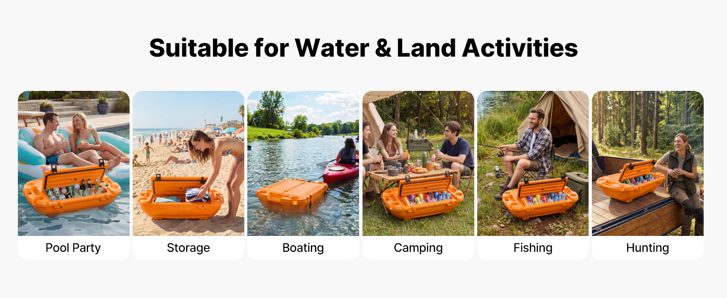 Je to viac než len plávajúca chladiaca taška na pádlovanie alebo plavbu loďou, funguje aj ako univerzálna mobilná chladiaca taška. Použite ju na chladenie nápojov pri kempovaní, ako stabilnú podložku a držiak na výbavu na pláži alebo na uchovávanie návnady a úlovkov počas rybárskych výletov.