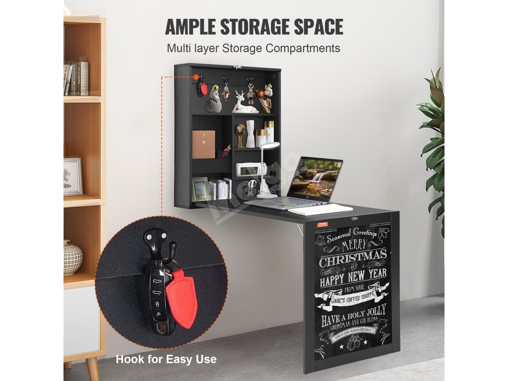 Tento nástenný stôl sa vyznačuje plynulým rozkladaním a skladaním. Po použití stôl jednoducho vyrovnajte. Ideálny do kompaktných priestorov, ako sú malé spálne, byty, podkrovia alebo obytné automobily. Viacvrstvové police a háčiky na jednoduché skladovanie.