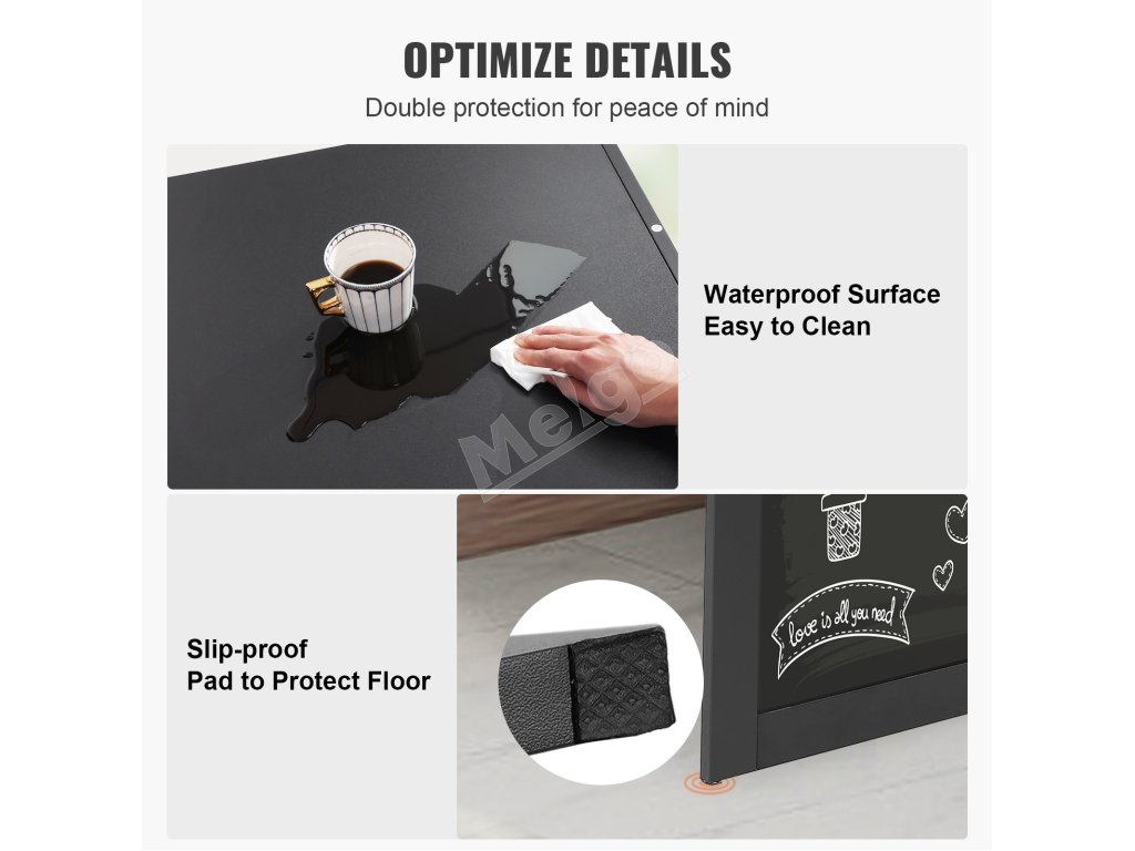 Vďaka povrchovej úprave tejto skladacej nástennej tabule je doska vodoodolná a ľahko sa čistí, čo zaručuje väčšiu odolnosť. Okrem toho protišmykové podložky na nohách stola chránia vašu podlahu, čím zabezpečujú protišmykovosť aj zvýšenú stabilitu.