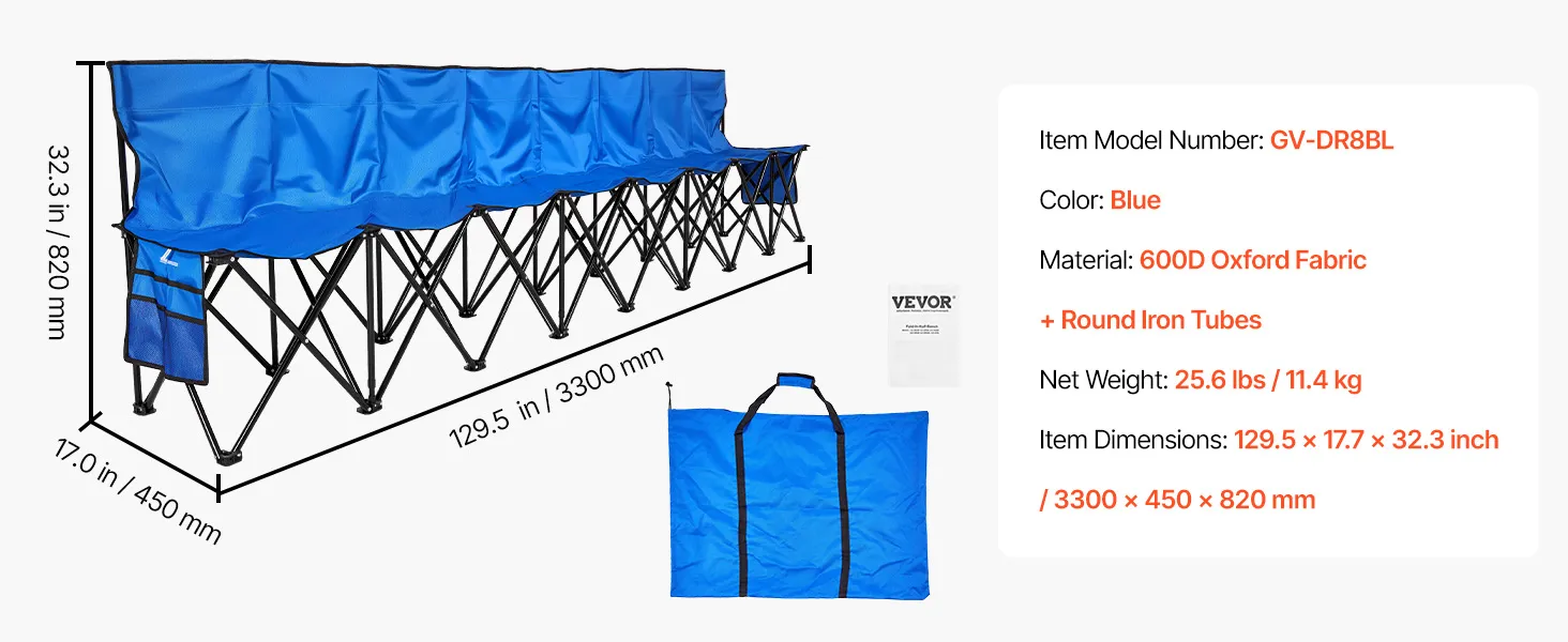 Tento výrobok je vyrobený z odolnej tkaniny 600D oxford so zosilnenými, vystuženými podpornými tyčami na zvýšenie pevnosti a stability. Vďaka skladaciemu dizajnu je ideálna na športové podujatia, večierky, kempovanie v prírode alebo na akúkoľvek príležitosť, pri ktorej potrebujete sedenie pri postrannej čiare.