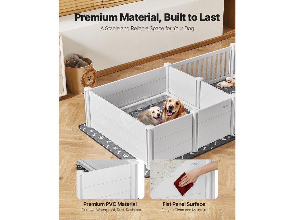 Zabudované koľajničky pomáhajú predchádzať nehodám s rozdrveným šteniatkom. protišmykové podložky 3M na základni udržujú steny stabilné. Prídavné panely umožňujú flexibilné rozšírenie, keď váš pes rastie.
