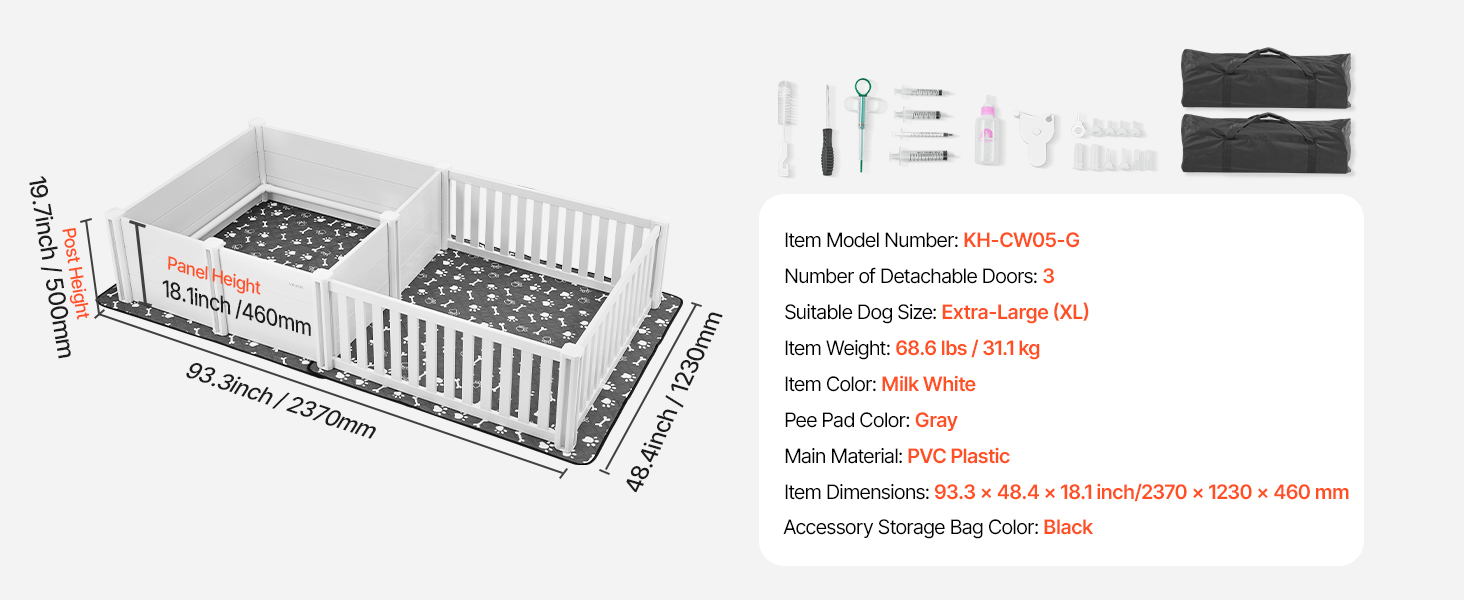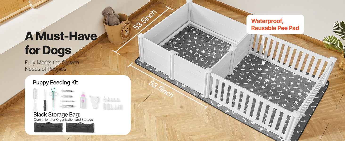 Obsahuje vodotesnú, opakovane použiteľnú podložku na močenie s rozmermi 53,5 × 53,5 palca / 1360 × 1360 mm, súpravu na kŕmenie pre rast šteňaťa a čiernu úložnú tašku na udržiavanie poriadku a jednoduché prenášanie dielov.