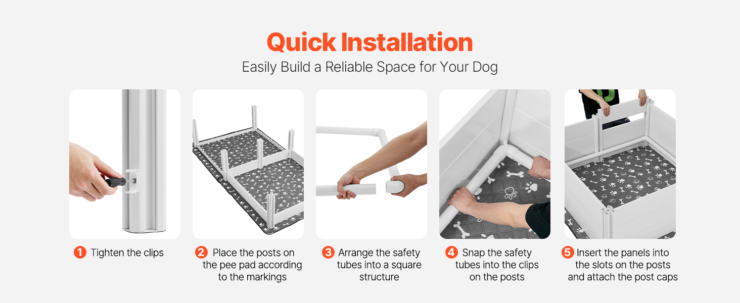Táto plastová ohrádka pre psov sa ľahko zacvakne pomocou predvŕtaných otvorov a laserom označených šípok, ktoré pomáhajú pri zostavovaní. Žiadne náradie, žiadny zmätok.