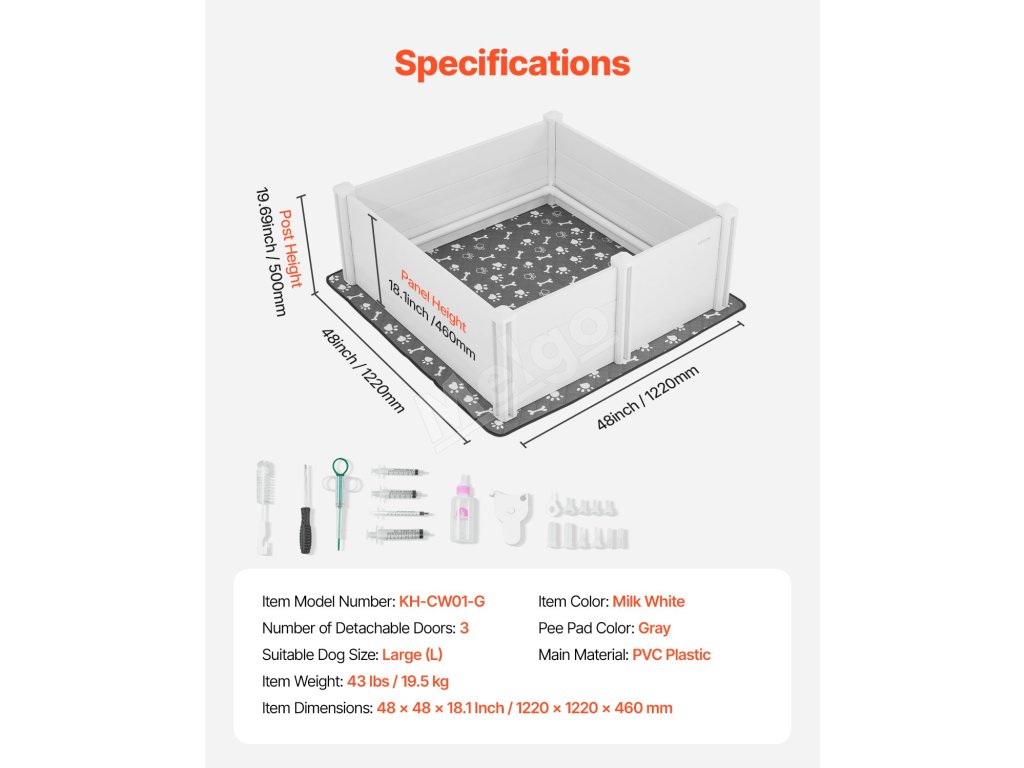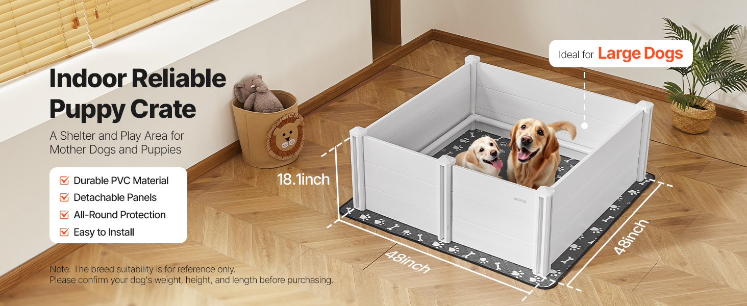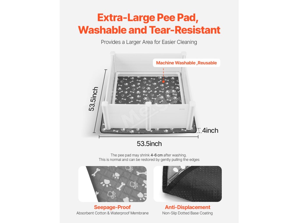 Priestranný 48x48x18,1 palca/1220x1220x460 mm box na pelešenie s umývateľnou podložkou na močenie pre veľké psy! Je vyrobený z odolného, vodeodolného PVC, ľahko sa čistí a jeho nastaviteľná výška dvierok je ideálna pre rast šteniat. Vďaka prehľadným vodiacim šípkam je nastavenie tiež bezproblémové. Pred kúpou si prosím POTVRĎTE veľkosť psa.