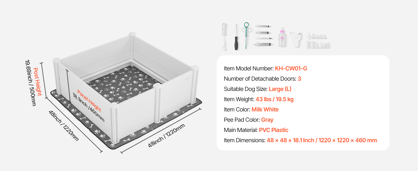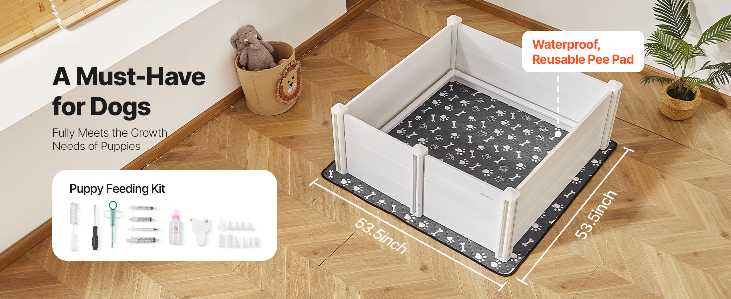 Súčasťou je vodotesná, opakovane použiteľná podložka na močenie s rozmermi 53,5 × 53,5 palca / 1360 × 1360 mm a súprava na kŕmenie šteniat. Podložka udržiava priestor suchý a pohodlný, zatiaľ čo súprava na kŕmenie podporuje rané štádium rastu s pokojom.