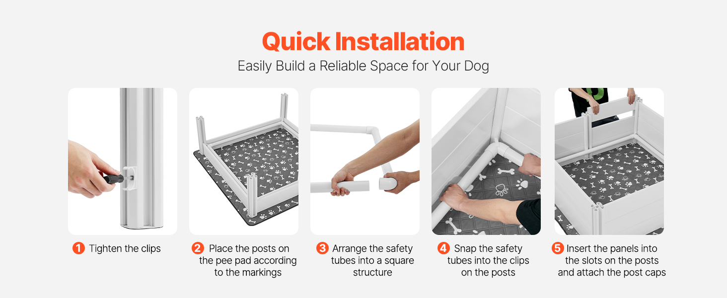 Táto plastová ohrádka pre psov je vybavená zacvakávacími konektormi, predvŕtanými otvormi na stĺpiky a laserom vygravírovanými šípkami pre bezproblémové nastavenie. Nie je potrebné žiadne náradie ani dohady.