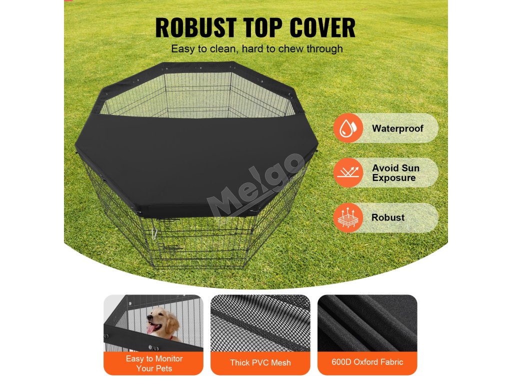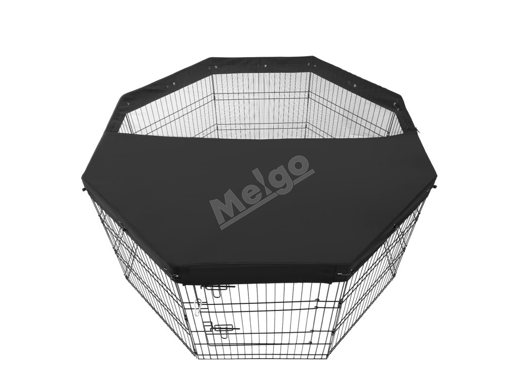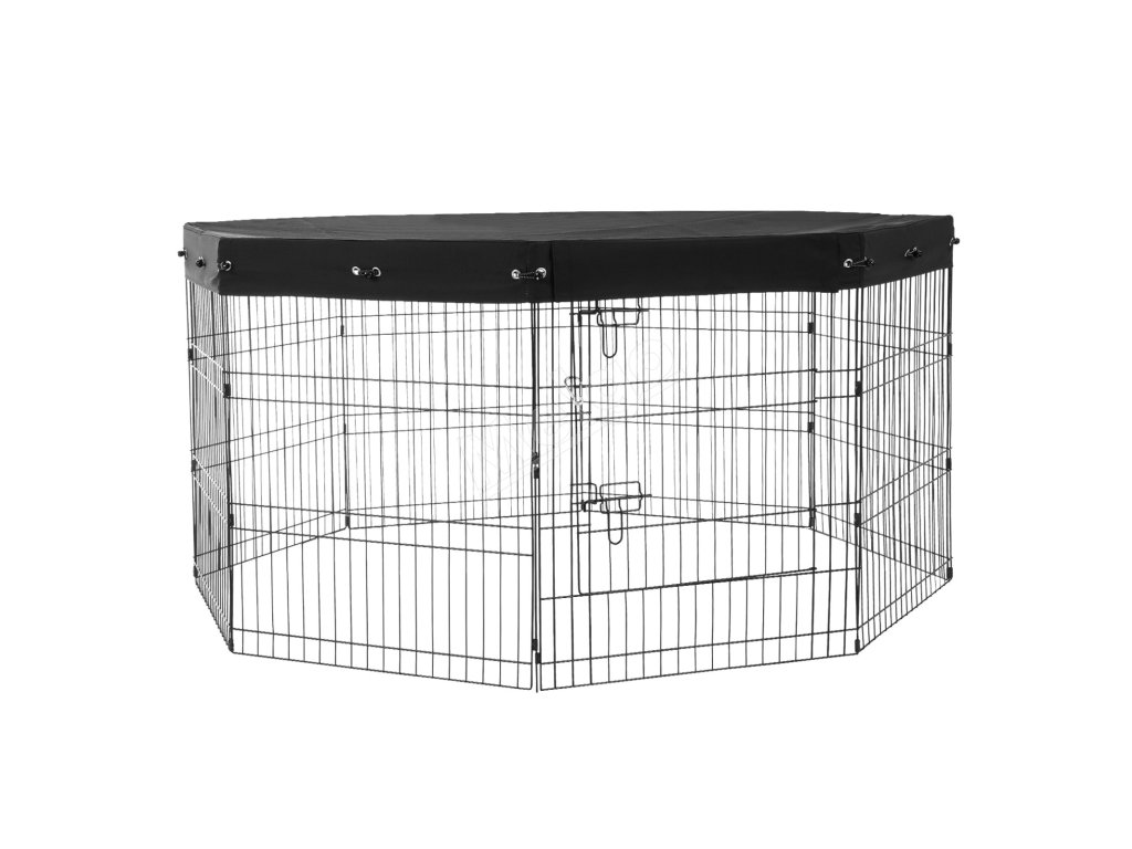 Koterec pre psov dosahuje maximálny priestor, keď je usporiadaný ako osemuholník, vhodný na vnútorné aj vonkajšie použitie. Vrchný kryt sa dá rozopnúť pre ľahký prístup majiteľa, vďaka čomu je ideálny na výcvik domácich miláčikov a ich zabezpečenie.