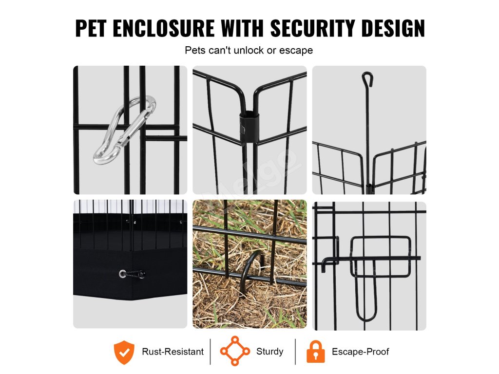 Ohrádka pre domáce zvieratá je bezpečne ukotvená, aby sa zabránilo jej posunutiu, so zámkami dverí, ktoré zabezpečujú, že domáce zvieratá nemôžu otvoriť bránu. Pevný kovový materiál je odolný proti rozhrýzaniu a zabraňuje prevráteniu alebo poškodeniu ohrádky domácimi zvieratami, čo vám umožní mať pokoj, keď sú domáce zvieratá ponechané bez dozoru.