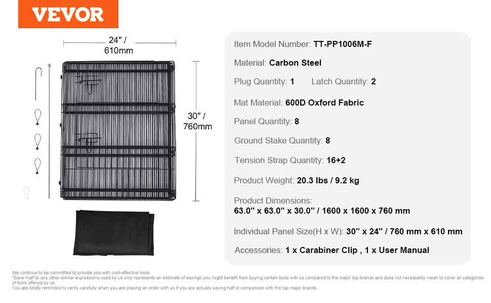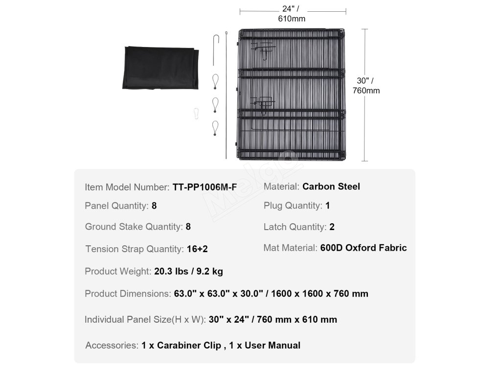 Ohrádka pre psov s 8 panelmi sa dodáva vopred zmontovaná, takže je ľahká a ľahko prenosná - ideálna na to, aby ste mohli vziať svojho domáceho miláčika na výlety do prírody alebo kempovanie. Pri používaní vonku ho možno postaviť bez podložky alebo vrchného krytu, čo umožňuje všestranné tvary podľa vašich potrieb.