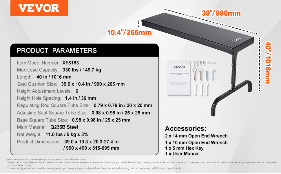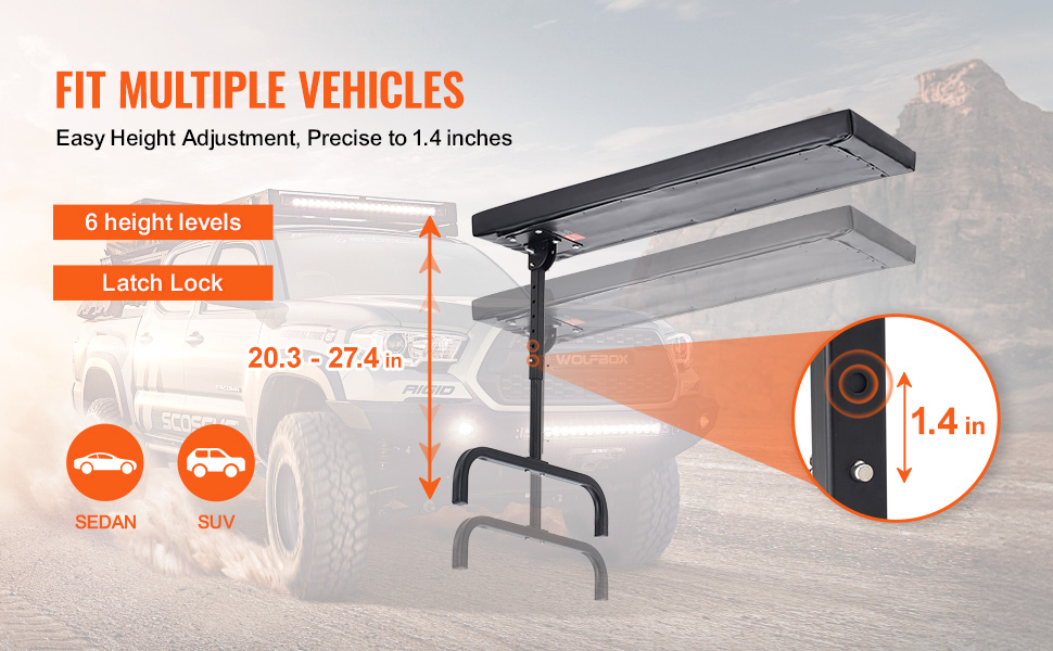 Vďaka otvorom v nohách na nastavenie výšky od 20,3 do 27,4 palca (515 - 695 mm) je táto automobilová plazivka vhodná pre širokú škálu vozidiel.