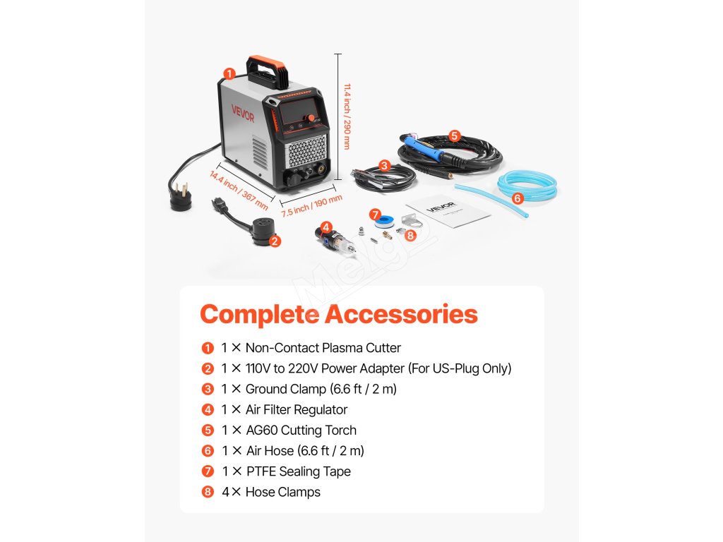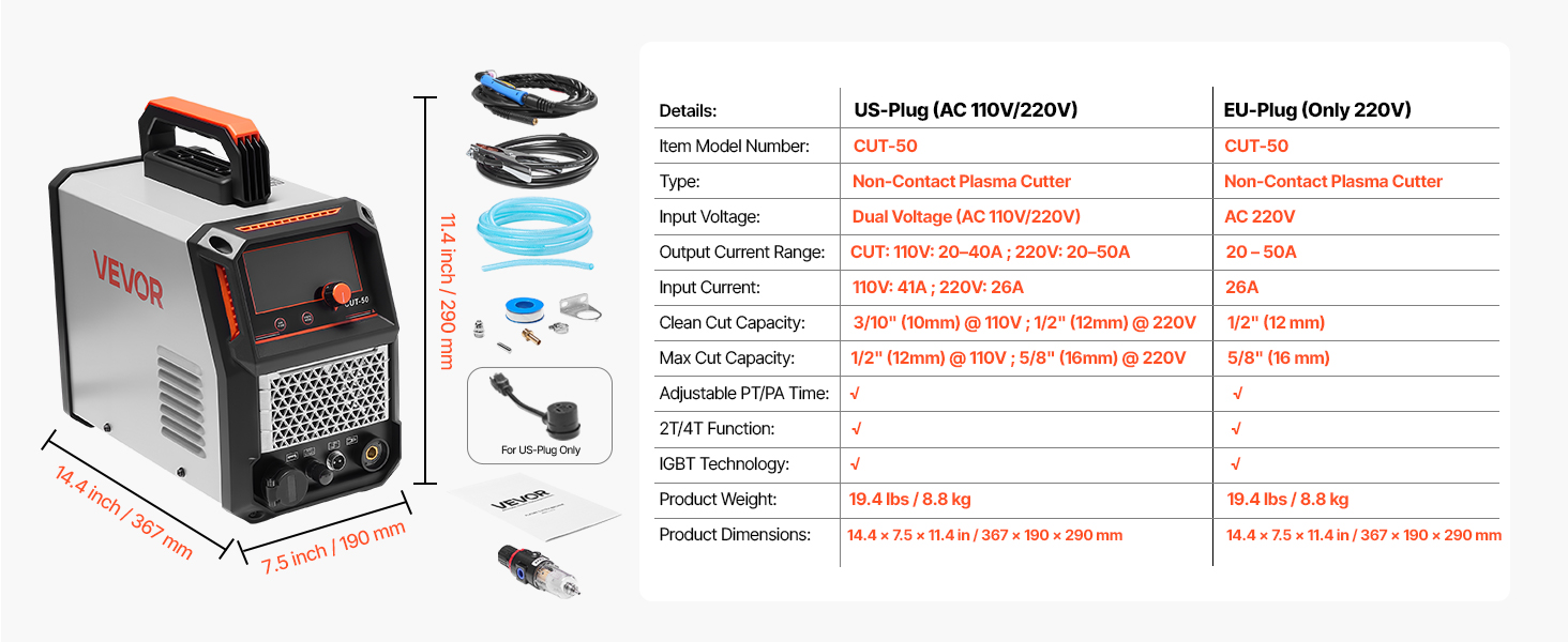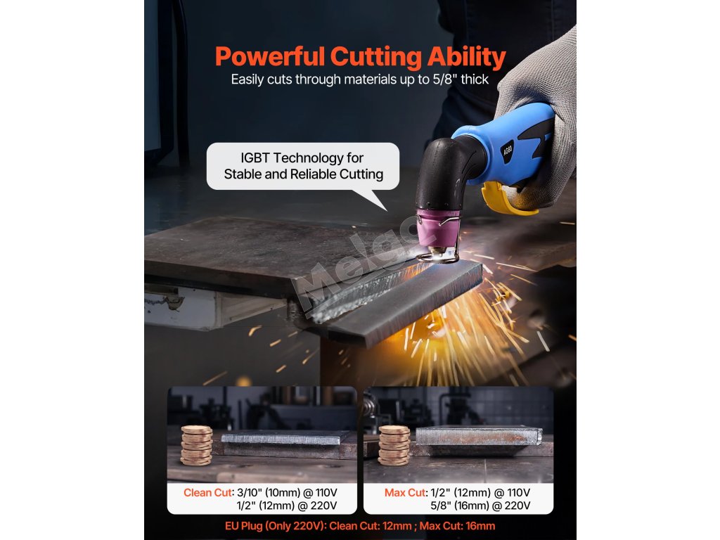 maximálny výstupný prúd 50 A podporuje čisté rezy do 12 mm, pričom maximálna hrúbka rezu je 16 mm. (Poznámka: len 220 V. Napájací adaptér nie je súčasťou dodávky)