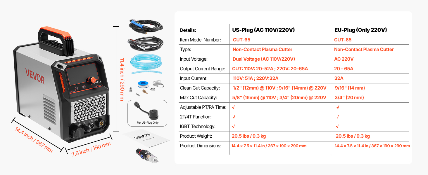 maximálny výstupný prúd 65 A podporuje čisté rezy do 14 mm, pričom maximálna hrúbka rezu je 20 mm. (Poznámka: len 220 V. Napájací adaptér nie je súčasťou dodávky)
