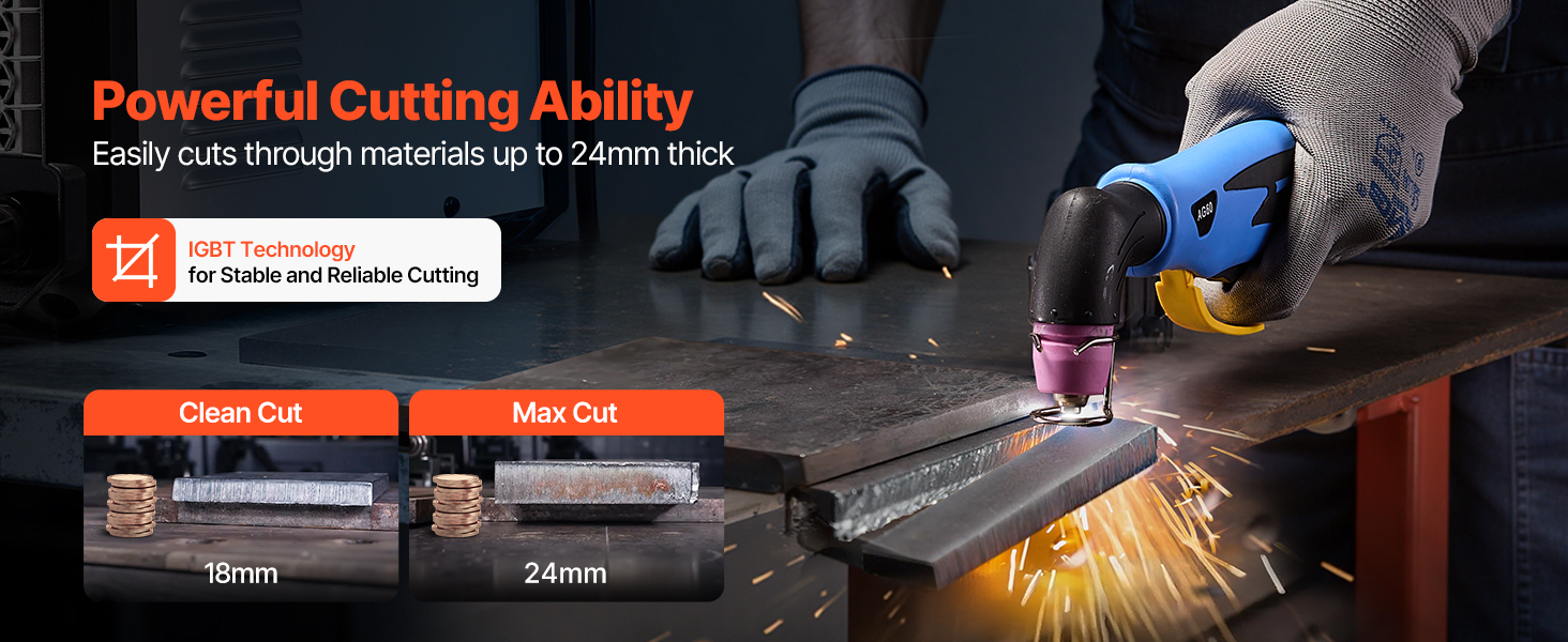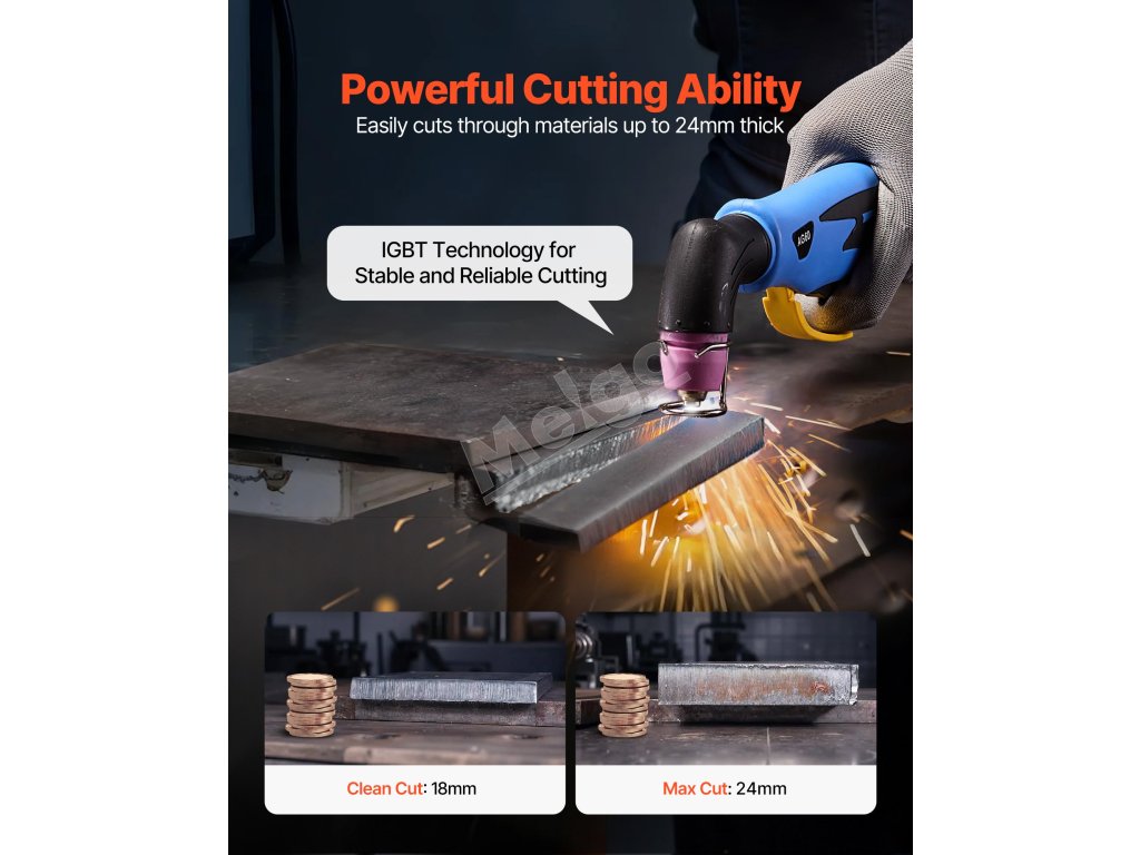 maximálny výstupný prúd 60 A podporuje čisté rezy do 18 mm, pričom maximálna hrúbka rezu je 24 mm. (Navrhnuté s 3-fázovým napájaním 400 V, určené predovšetkým na priemyselné použitie)
