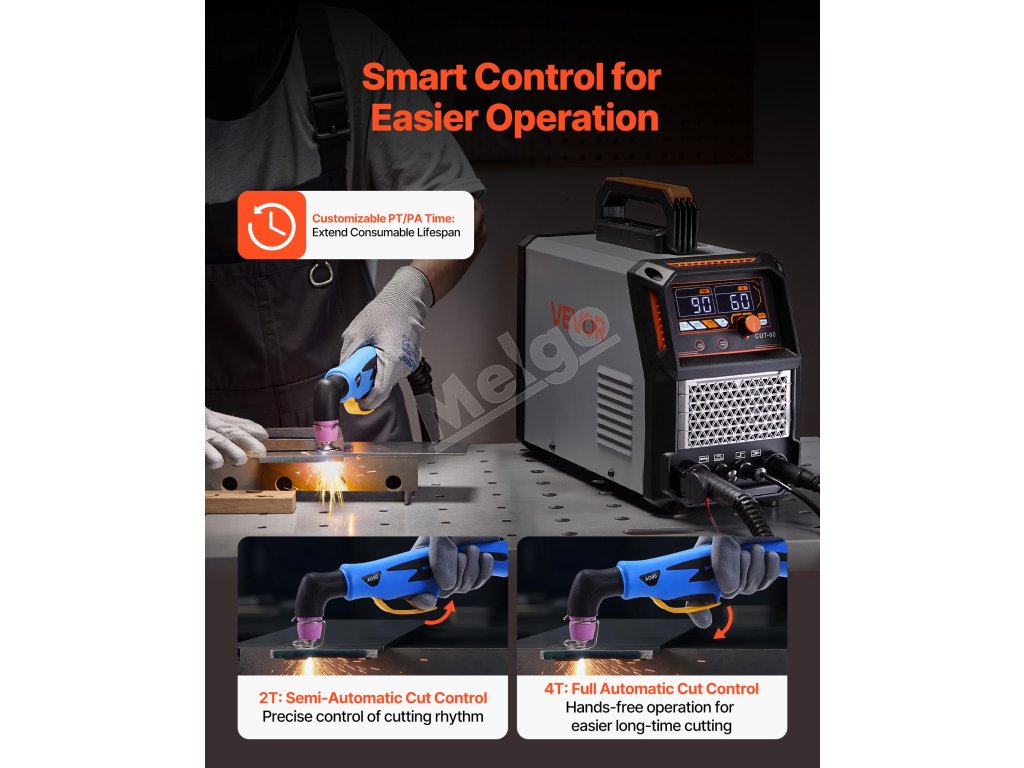 Táto 400 V 3-fázová plazmová rezačka poskytuje silný 60 A výstup, ktorý umožňuje jednoduché rezanie rôznych kovov. Vďaka bezdotykovému pilotnému oblúku, inteligentnému ovládaniu, funkcii 2T/4T, prehľadnému digitálnemu displeju a kompletnému príslušenstvu zabezpečuje stabilný výstup na plynulé a efektívne rezanie pre priemyselné aplikácie.