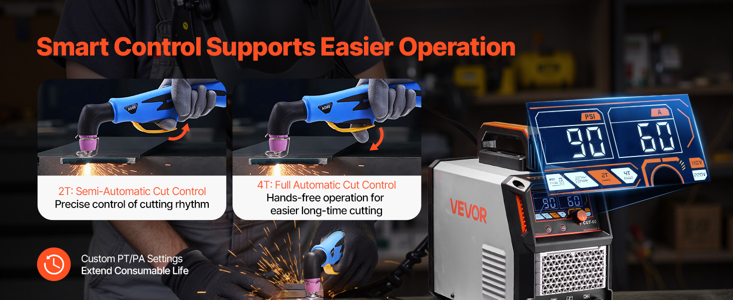Naša 3-fázová plazmová rezačka disponuje funkciami 2T aj 4T: 2T umožňuje poloautomatické rezanie na krátke a presné úlohy, 4T podporuje automatické rezanie na dlhšie nepretržité operácie. Podporuje aj nastaviteľný čas PT/PA na predĺženie životnosti spotrebného materiálu.