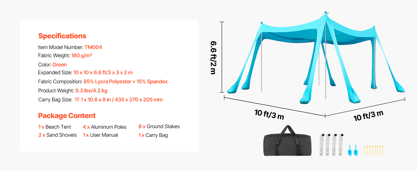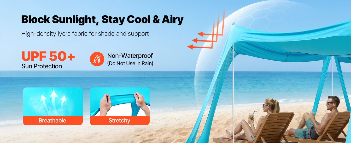 Tento plážový prístrešok je vyrobený z hybridnej lycry a poskytuje ochranu proti slnku UPF 50+, aby sa zabránilo spáleniu pokožky počas outdoorových aktivít. Hustá väzba a vynikajúca pružnosť zlepšujú odolnosť proti roztrhnutiu a zabezpečujú dlhodobú ochranu proti slnku a meniacemu sa počasiu.