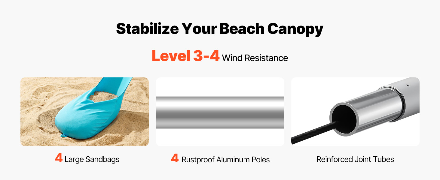 Tento plážový slnečník, navrhnutý pre váš pokoj, je vybavený odolnými vrecami s pieskom, zosilnenými hliníkovými podpornými tyčami a elastickými hornými šnúrami, ktoré spoločne vytvárajú posilnený stabilizačný systém. Je navrhnutý tak, aby odolal vetru s rýchlosťou 4, čím znižuje riziko prevrátenia alebo zranenia za veterných podmienok.
