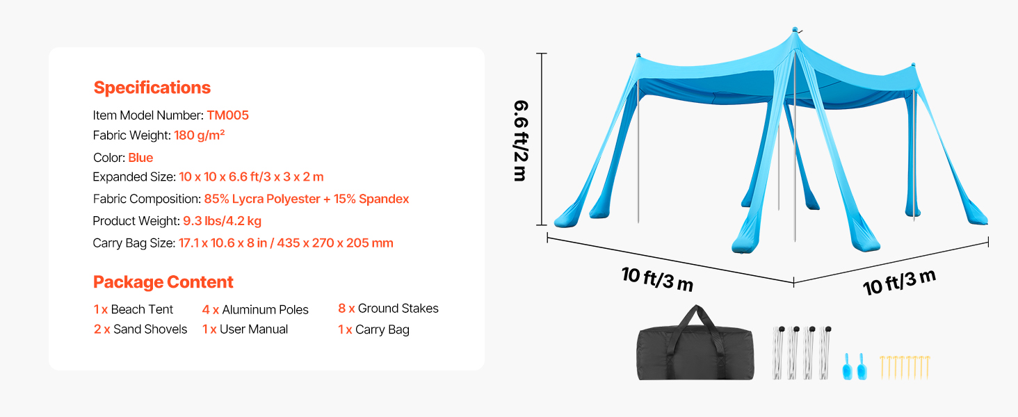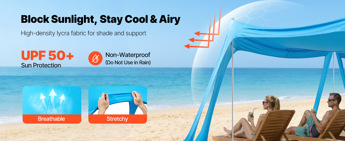 Tento plážový prístrešok je vyrobený z hybridnej lycrové tkaniny a poskytuje ochranu proti slnku UPF 50+, aby sa zabránilo spáleniu pokožky počas outdoorových aktivít. Hustá väzba a vynikajúca pružnosť zlepšujú odolnosť proti roztrhnutiu a zabezpečujú dlhodobú ochranu proti slnku a meniacemu sa počasiu.