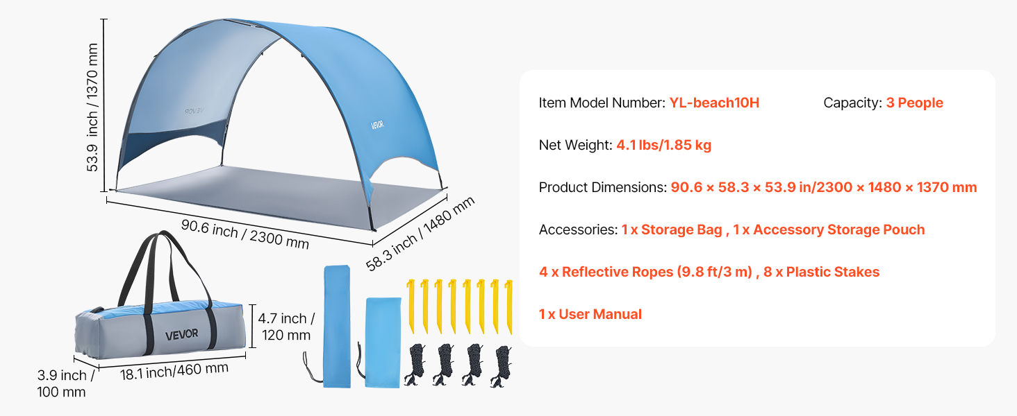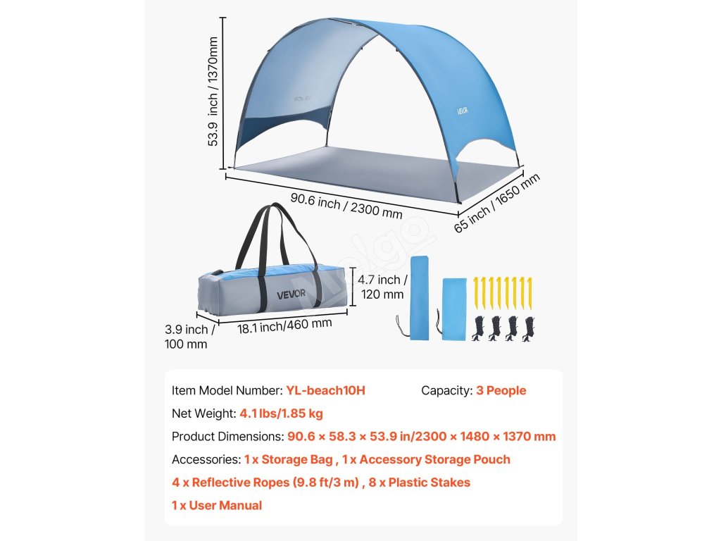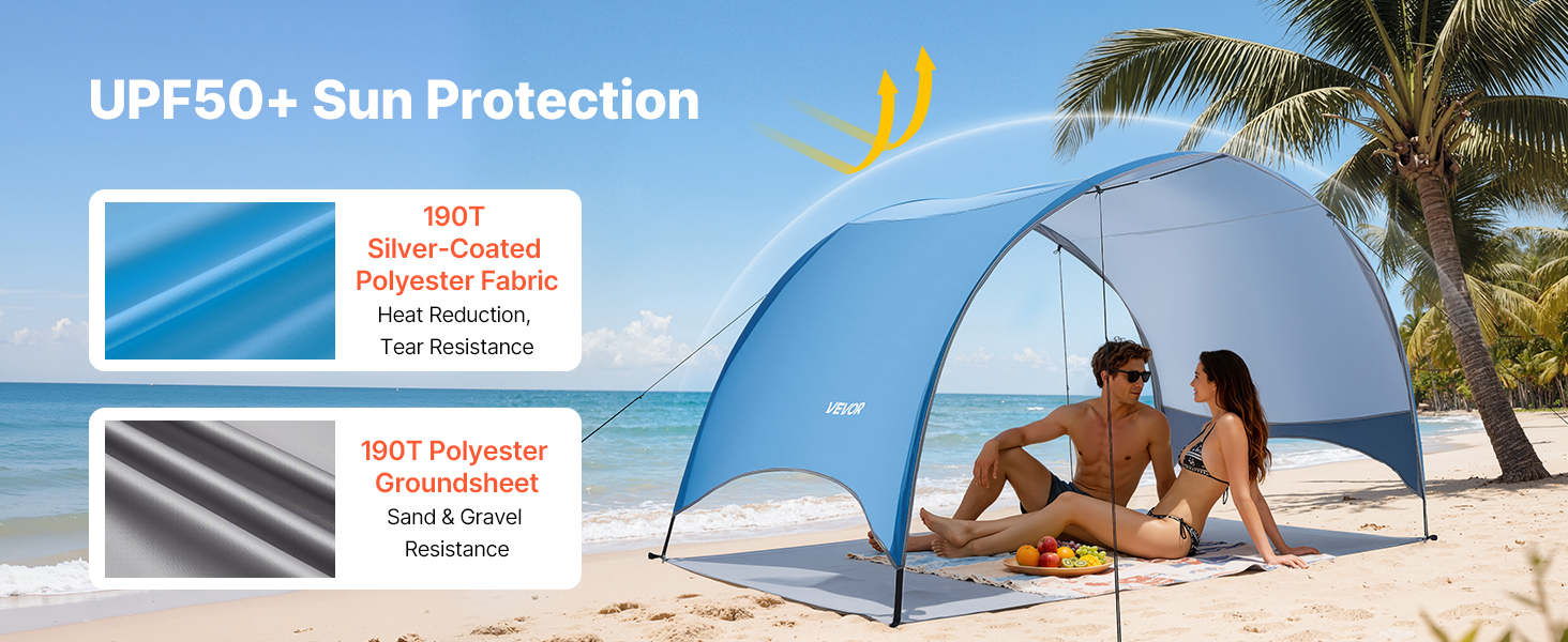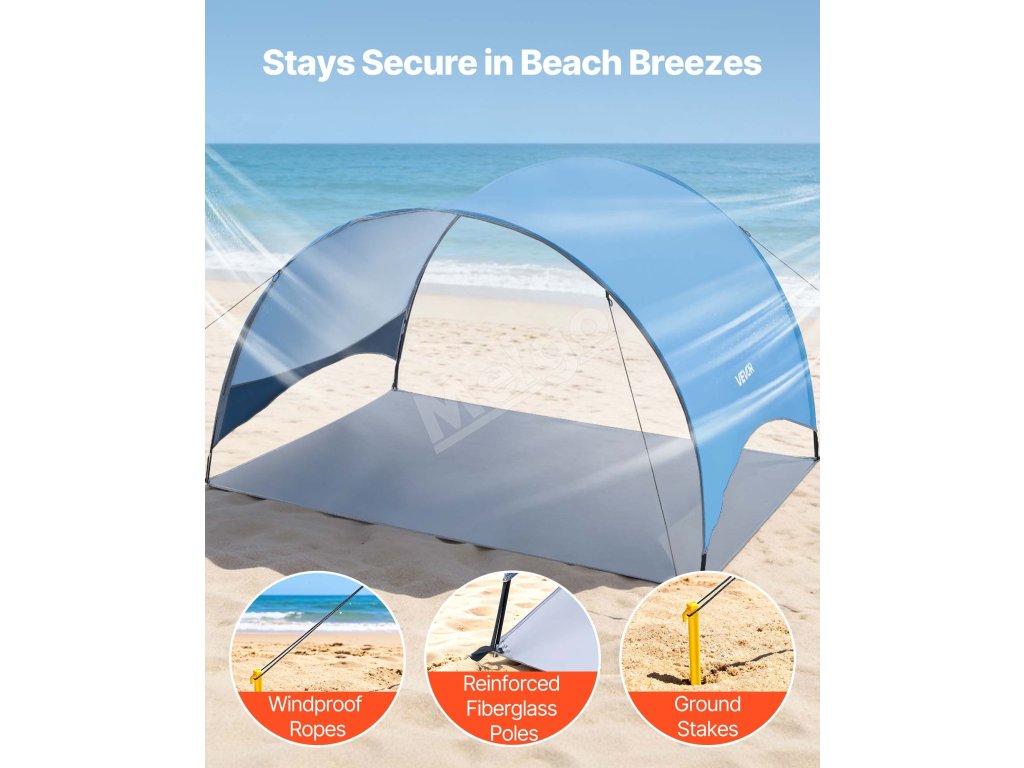 Tento kempingový slnečný prístrešok je vybavený vystuženými podpornými tyčami, vetruodolnými lanami a zemnými kolíkmi, ktoré ho udržujú na mieste. Vytvorený pre veterné pláže a pobrežie s nárazovým vetrom – váš tieň zostane na mieste, zatiaľ čo vy relaxujete.