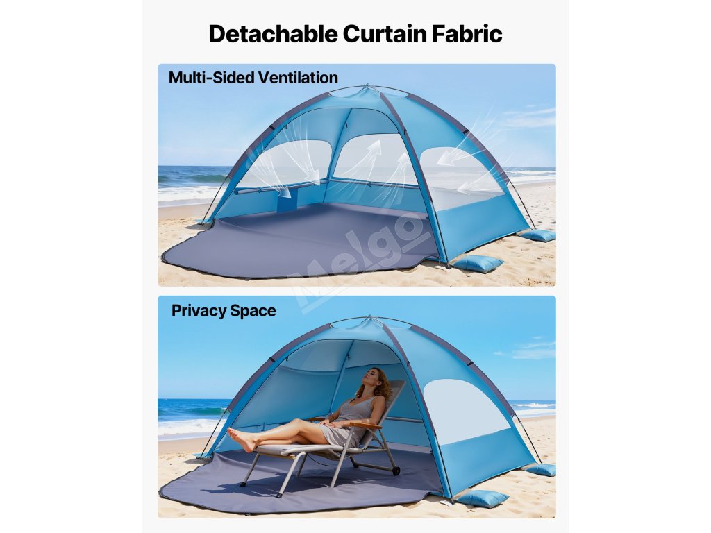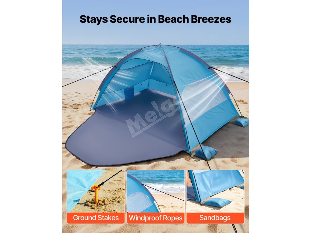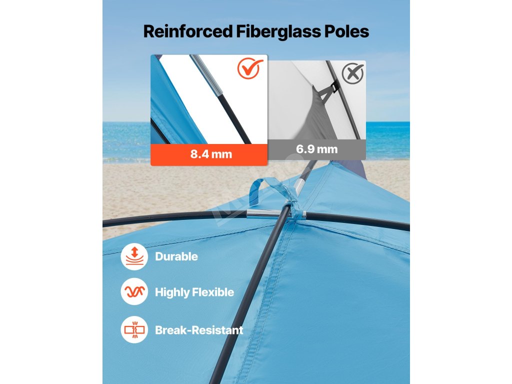 Tento kempingový slnečný prístrešok je vybavený vystuženými sklenenými vláknami, vetruodolnými lanami, zemnými kolíkmi a vrecami s pieskom, ktoré ho udržujú na mieste. Vytvorený pre veterné pláže a pobrežie s nárazovým vetrom – váš tieň zostane na mieste, kým vy relaxujete.