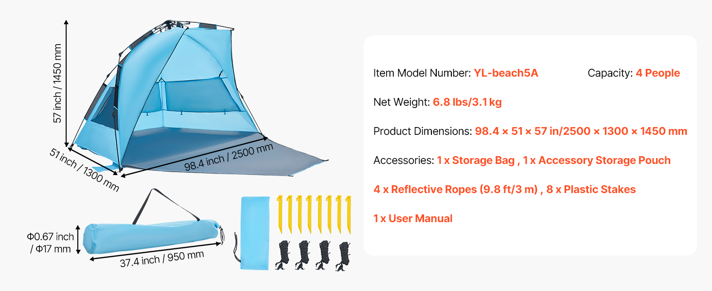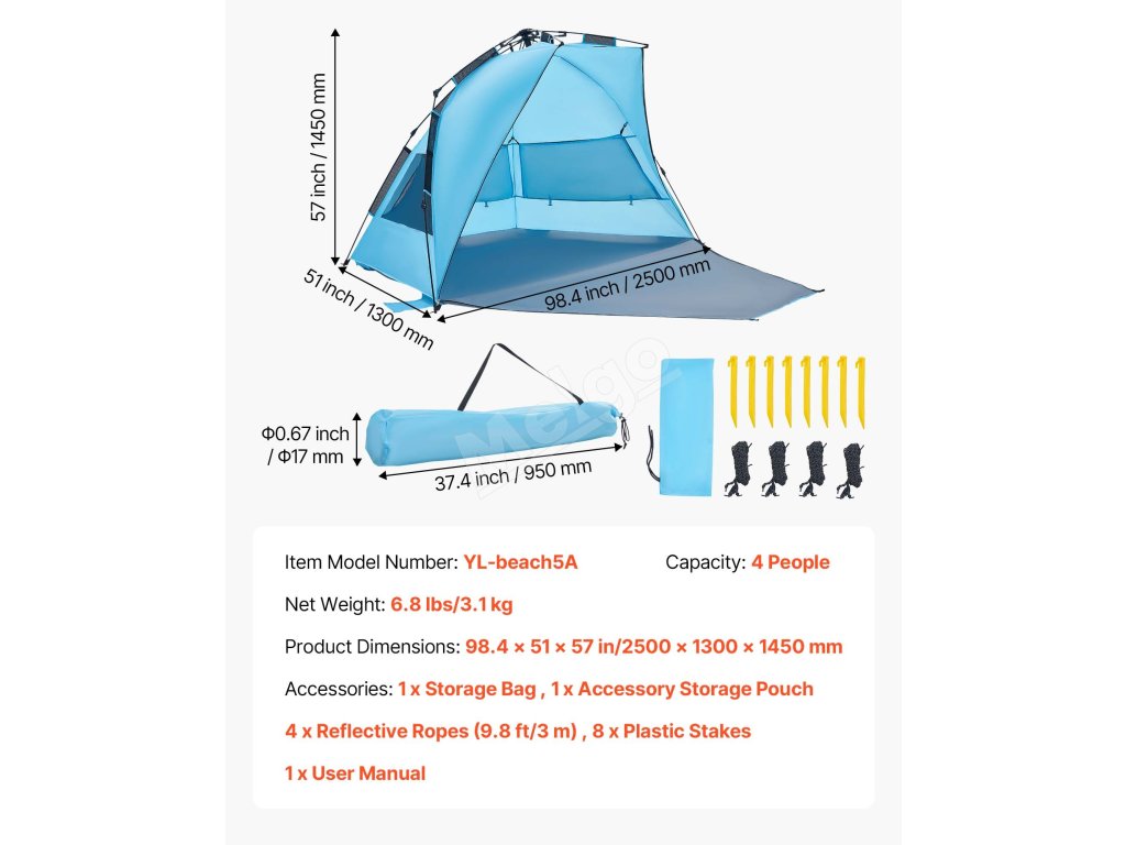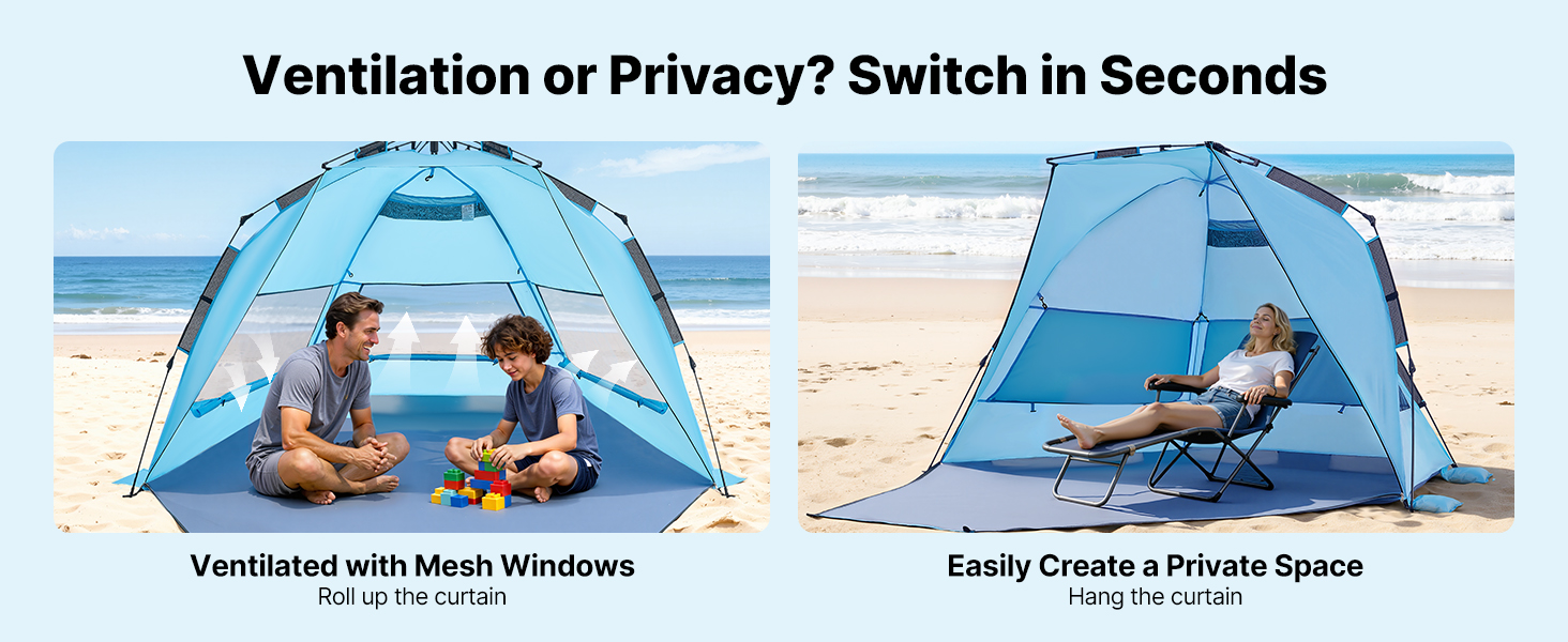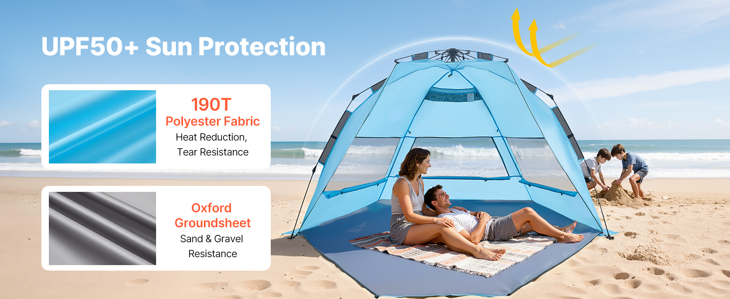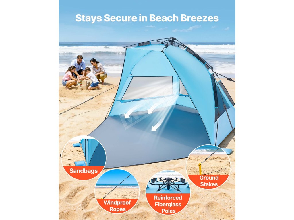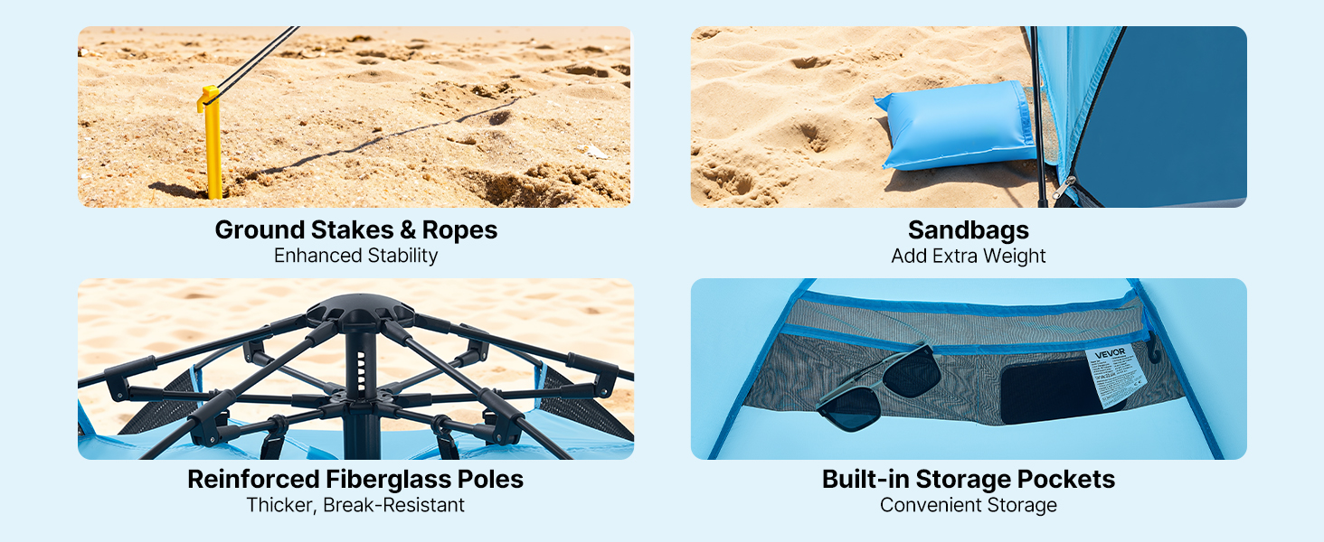 Tento kempingový slnečný prístrešok je vybavený vystuženými podpornými tyčami, vetruodolnými lanami a zemnými kolíkmi, ktoré ho udržia na mieste. Vytvorený pre veterné pláže a pobrežie s nárazovým vetrom – váš tieň zostane na mieste, zatiaľ čo vy relaxujete.