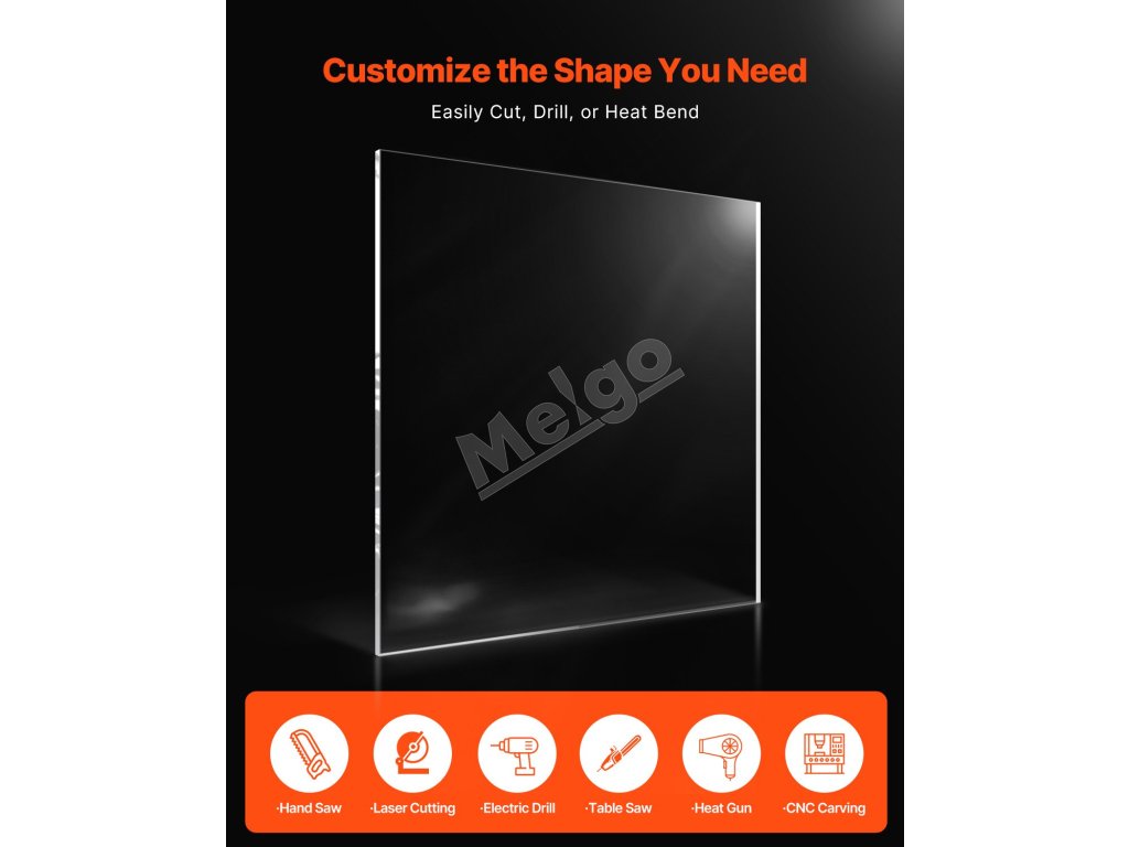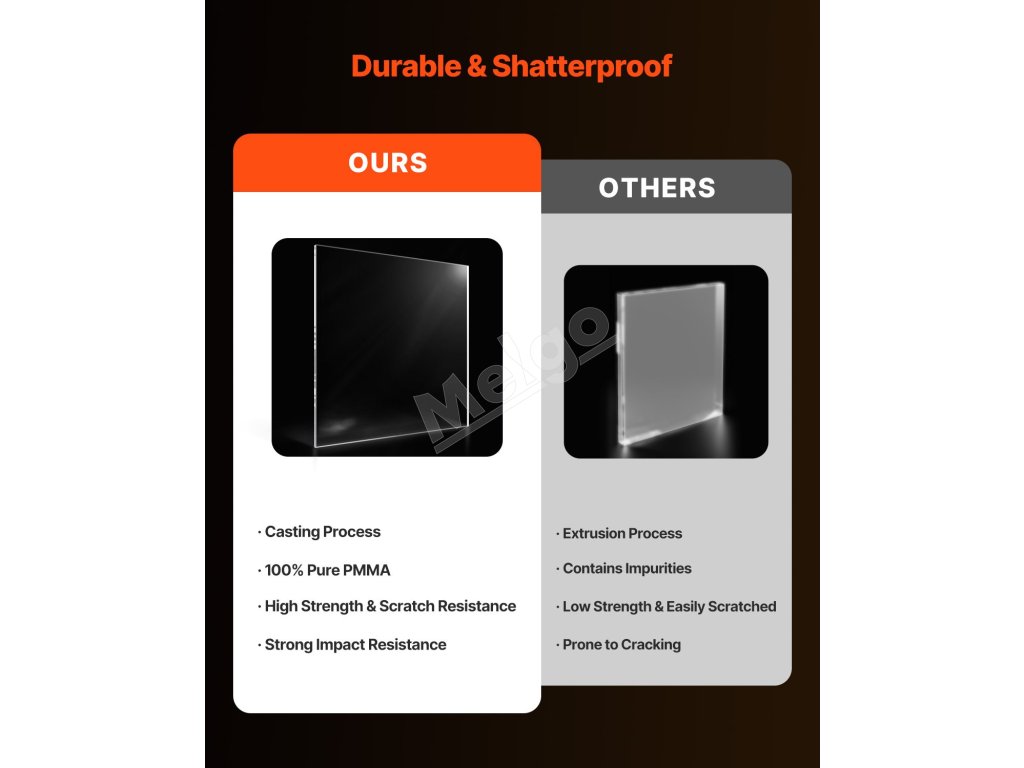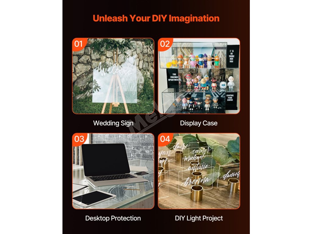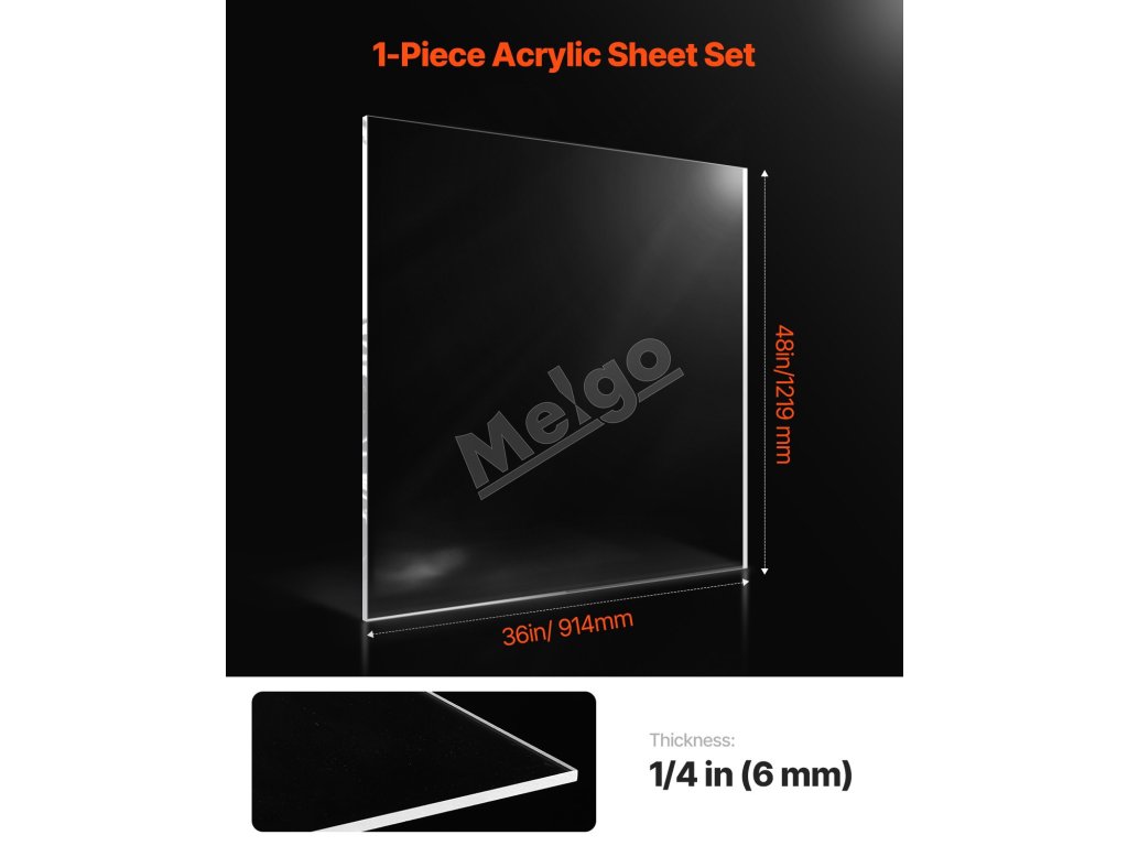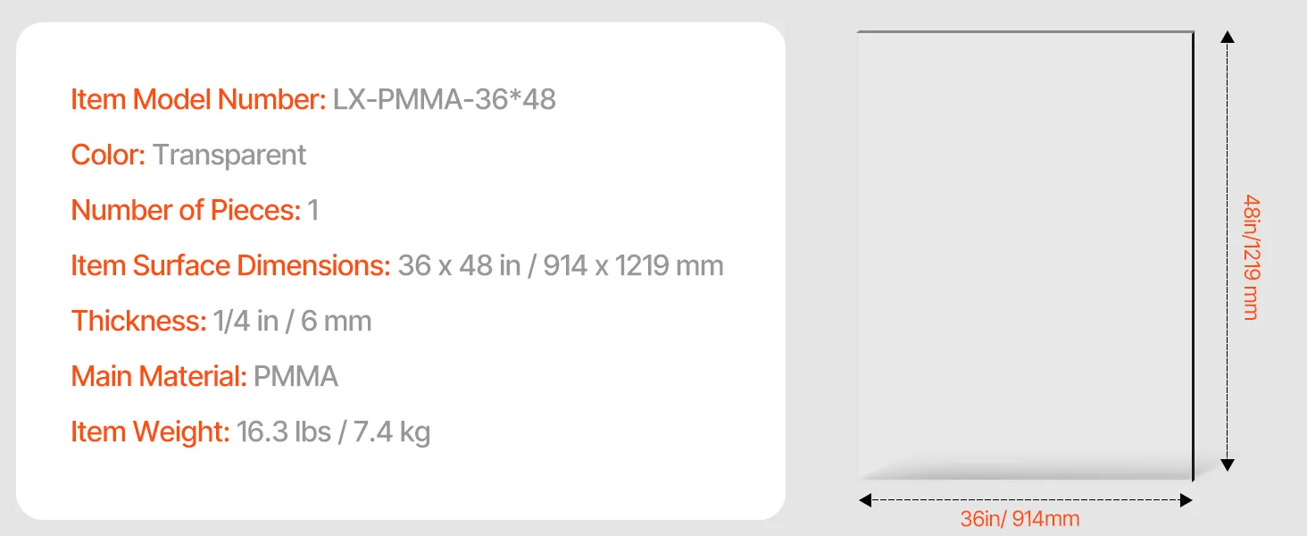 Každý list má rozmery 36 x 48 palcov, hrúbku 1/4 palca (6 mm) a je vyrobený z prvotriedneho materiálu PMMA so 100 % čistým MMA pre vynikajúcu priehľadnosť a pevnosť. Ľahko sa reže, vŕta alebo ohýba za tepla, je ideálny na remeselné práce pre domácich majstrov, svadobné tabule, nábytkové police, ochranné bariéry a iné!