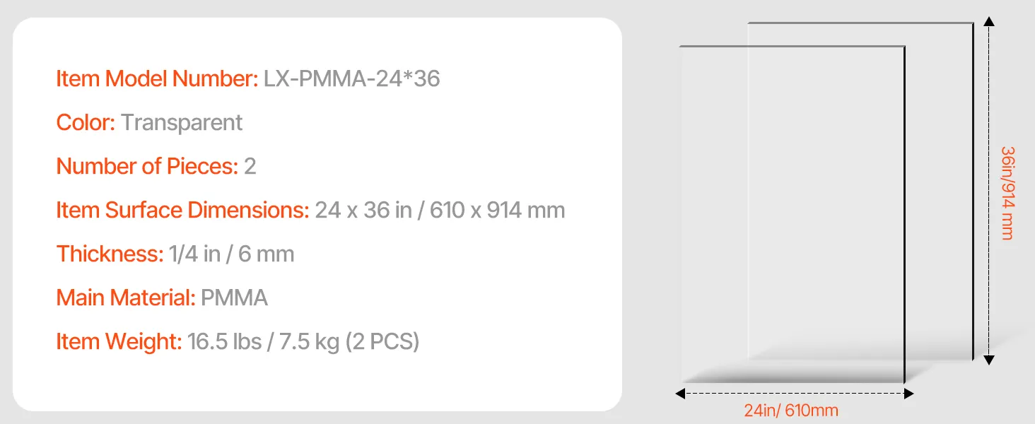 Každý list má rozmery 24 x 36 palcov, hrúbku 1/4 palca (6 mm) a je vyrobený z prvotriedneho materiálu PMMA so 100 % čistým MMA pre vynikajúcu priehľadnosť a pevnosť. Ľahko sa reže, vŕta alebo ohýba za tepla, je ideálny na kutilské práce, svadobné tabule, nábytkové police, ochranné bariéry a ďalšie!
