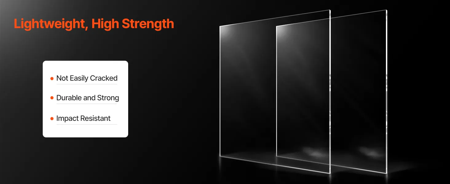 Tieto plastové dosky sa môžu pochváliť vysokou pevnosťou a odolnosťou voči nárazom, vďaka čomu sa ťažko rozbijú. Na oboch stranách sa dodávajú ochranné fólie, ktoré sa musia pred použitím odstrániť, čím sa zabezpečí vynikajúca priehľadnosť s vysokým rozlíšením.