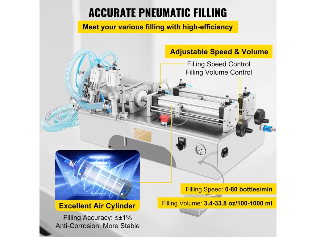 Tento stroj na plnenie tekutín a pasty využíva prémiový plynový valec, ktorý má obrovský výkon a stabilný tlak vzduchu. Objem a rýchlosť plnenia možno ľubovoľne regulovať. Rozsah plnenia je 3,4 - 33,8 oz/100 - 1 000 ml a rýchlosť plnenia je maximálne 80 fliaš/min.