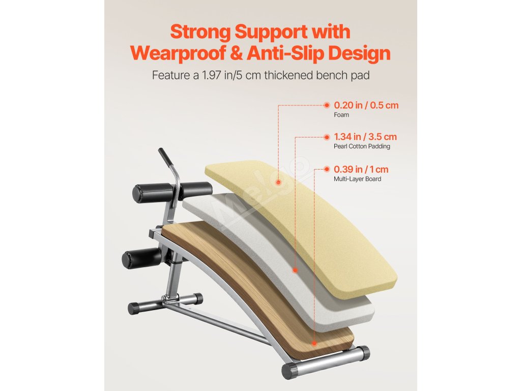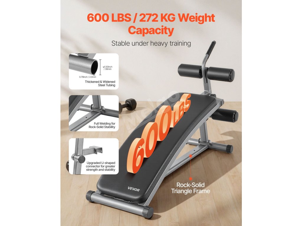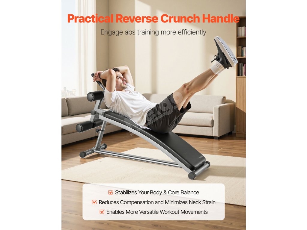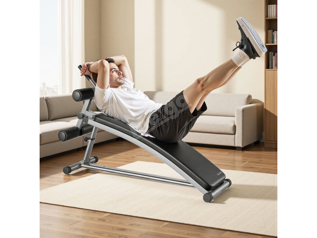 Táto lavička na cvičenie v sede má nastaviteľnú výšku a oporu pre nohy, je vyrobená z trojuholníkového rámu z odolnej ocele pre veľkú stabilitu. Praktická rukoväť na opačné krčenie pomáha pri tréningu brušných svalov. Ľahko sa zostavuje a je ideálnou voľbou pre začiatočníkov aj skúsených fitnes nadšencov.