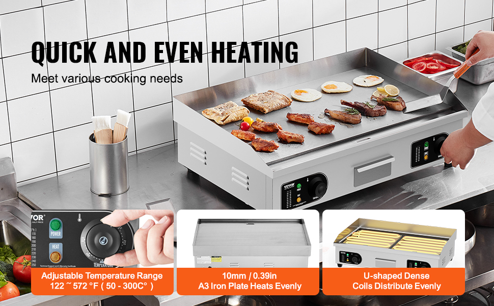 Komerčná panvica má nastaviteľný teplotný rozsah 122 - 572 ℉ (50 - 300 °C). A zväčšená pracovná plocha spĺňa požiadavky na prípravu rôznych potravín.