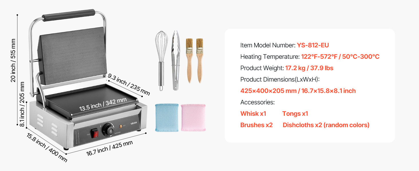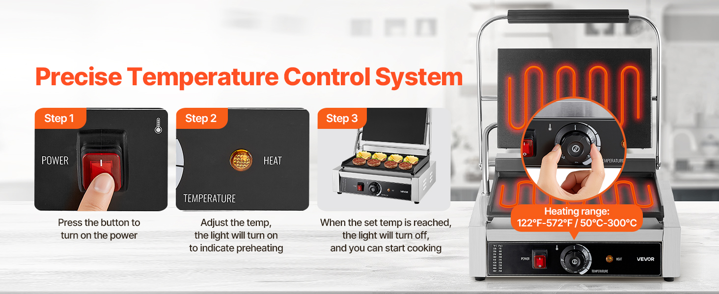 Elektrický sendvičovač panini je navrhnutý s presným systémom regulácie teploty s rozsahom regulácie teploty 122°F-572°F / 50 °C-300 °C. Teplotu si môžete nastaviť podľa svojich potrieb, vďaka čomu je vhodný pre viacerých používateľov.