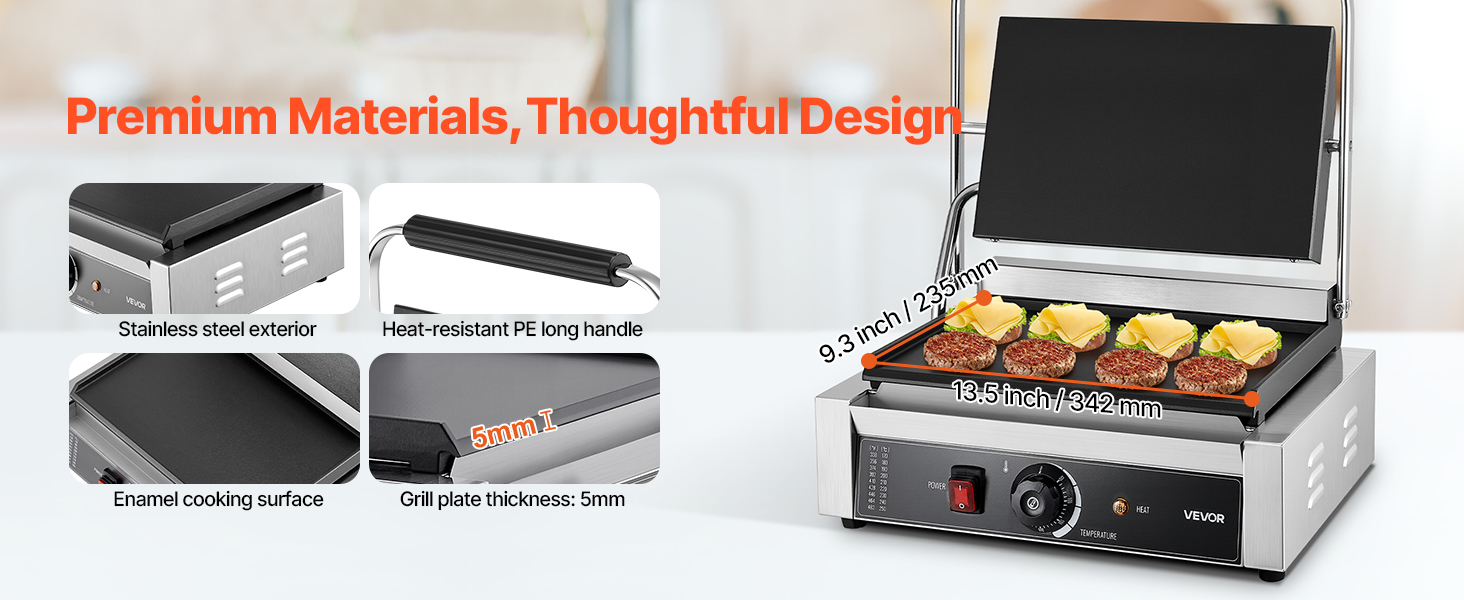 Komerčný sendvičový gril je vybavený vonkajším povrchom z nehrdzavejúcej ocele so žiaruvzdornou rukoväťou. Pre väčšiu bezpečnosť je vybavený protišmykovými nožičkami. Viaceré vetracie otvory na oboch stranách účinne odvádzajú teplo a pomáhajú udržiavať primeranú teplotu zariadenia.
