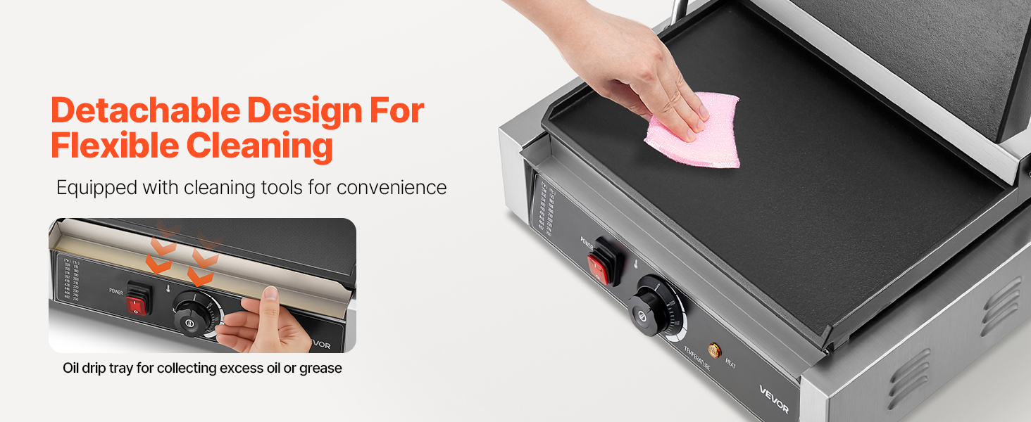 Elektrický sendvičovač z nehrdzavejúcej ocele obsahuje odnímateľný podnos, ktorý zachytáva všetku mastnotu, olej alebo zvyšky, ktoré spadnú z varnej dosky, čo uľahčuje jeho čistenie.