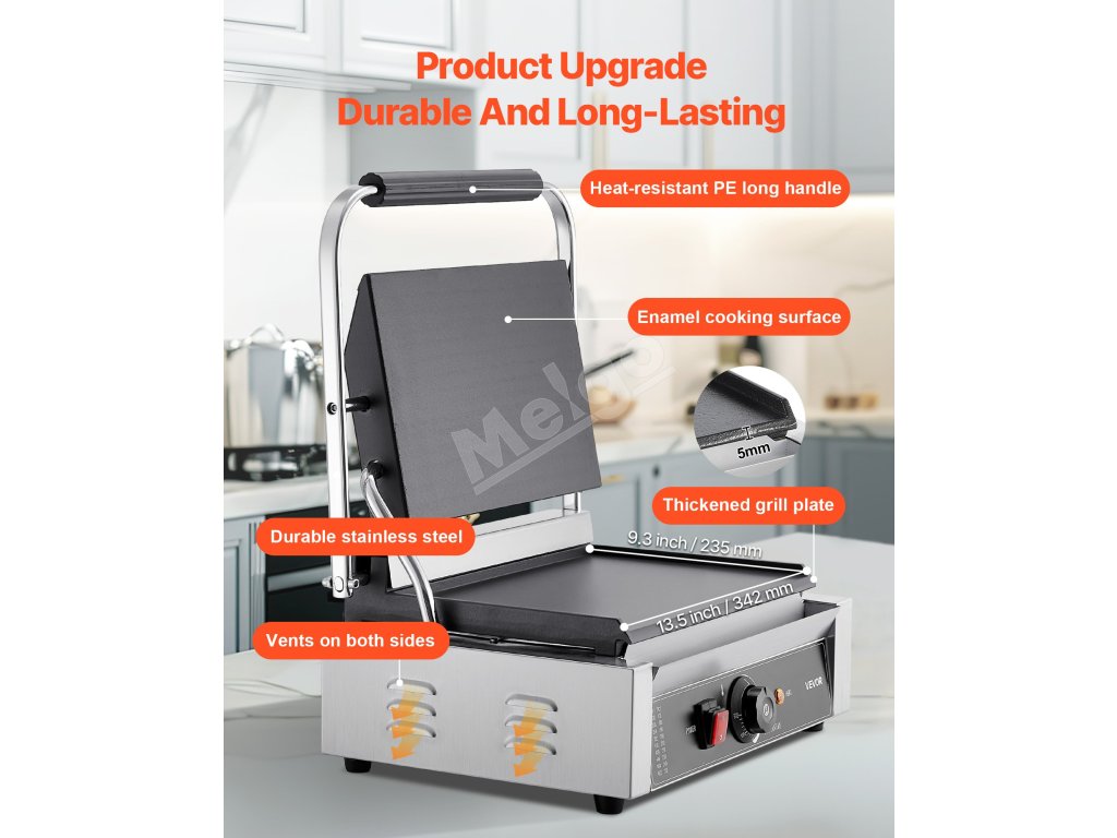 Komerčný sendvičový gril je vybavený vonkajším povrchom z nehrdzavejúcej ocele so žiaruvzdornou rukoväťou. Pre väčšiu bezpečnosť je vybavený protišmykovými nožičkami. Viaceré vetracie otvory na oboch stranách účinne odvádzajú teplo a pomáhajú udržiavať primeranú teplotu zariadenia.