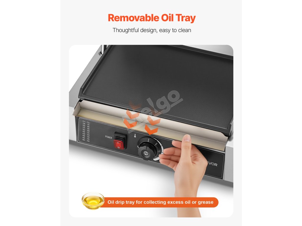 Elektrický sendvičovač z nehrdzavejúcej ocele obsahuje odnímateľný podnos, ktorý zachytáva všetku mastnotu, olej alebo zvyšky, ktoré spadnú z varnej dosky, čo uľahčuje jeho čistenie.