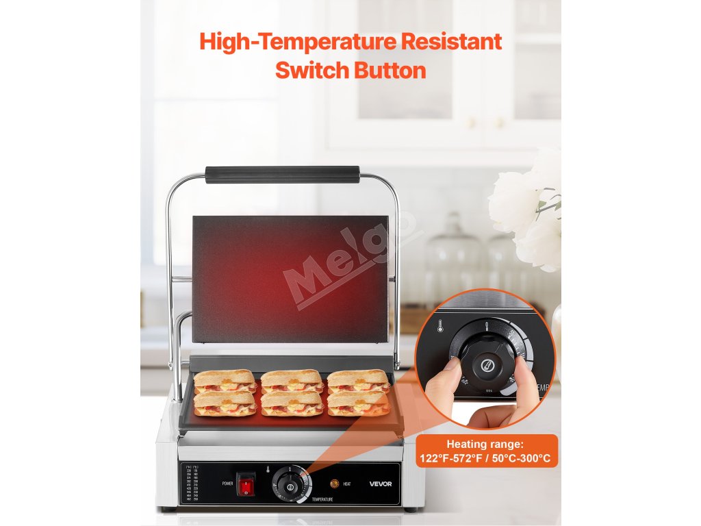 Elektrický sendvičovač panini je navrhnutý s presným systémom regulácie teploty s rozsahom regulácie teploty 122°F-572°F / 50 °C-300 °C. Teplotu si môžete nastaviť podľa svojich potrieb, vďaka čomu je vhodný pre viacerých používateľov.