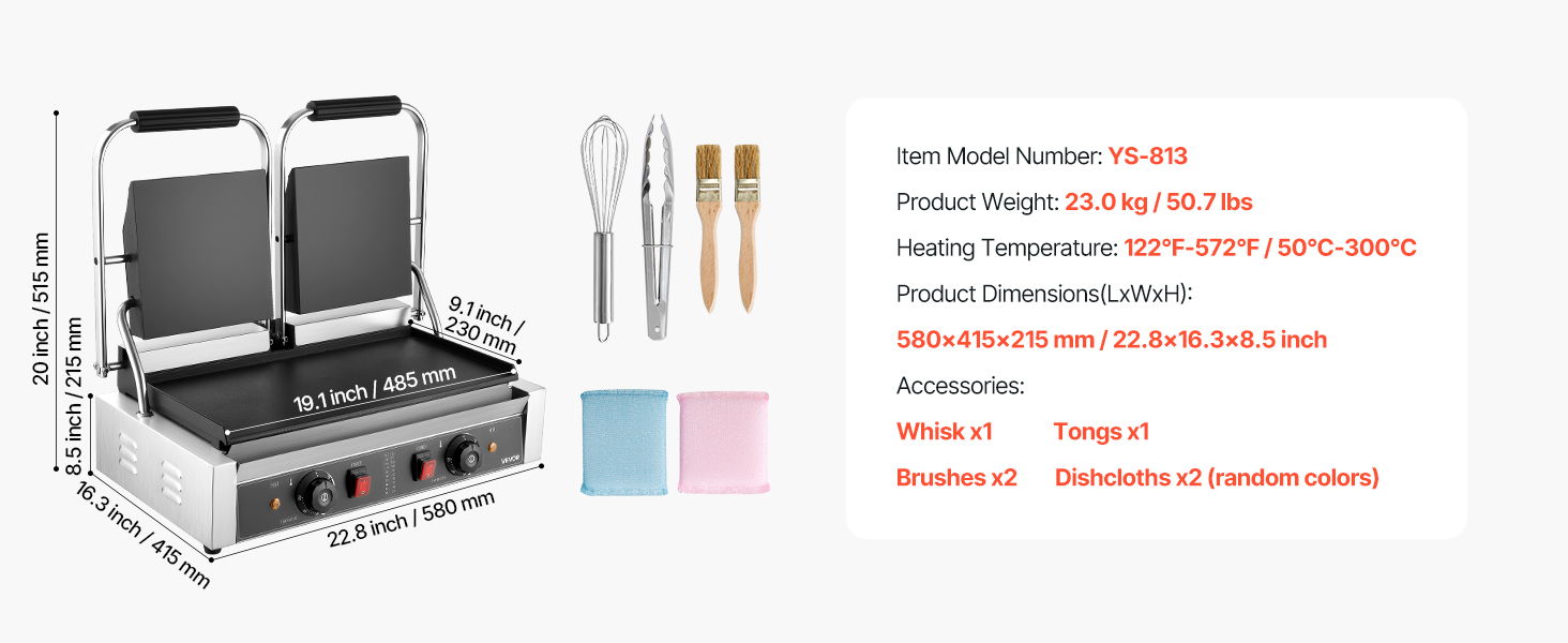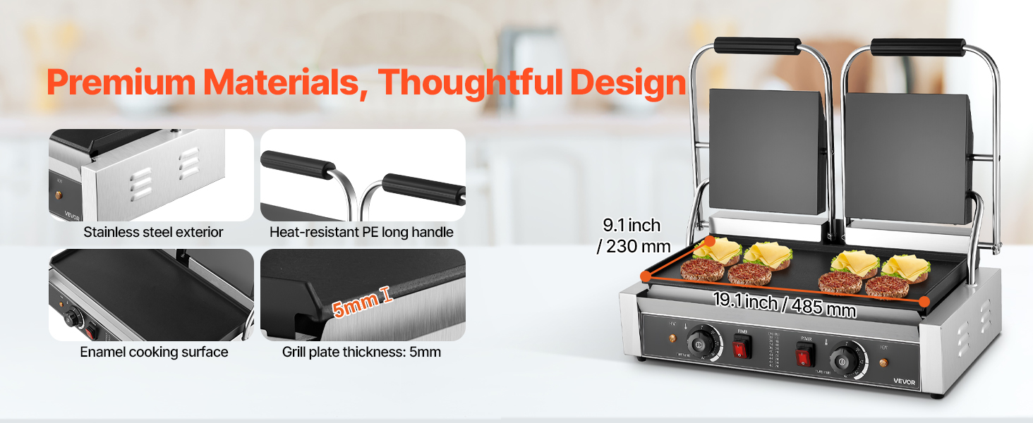 Komerčný sendvičový gril je vybavený vonkajším povrchom z nehrdzavejúcej ocele so žiaruvzdornou rukoväťou. Pre väčšiu bezpečnosť je vybavený protišmykovými nožičkami. Viaceré vetracie otvory na oboch stranách účinne odvádzajú teplo a pomáhajú udržiavať primeranú teplotu zariadenia.