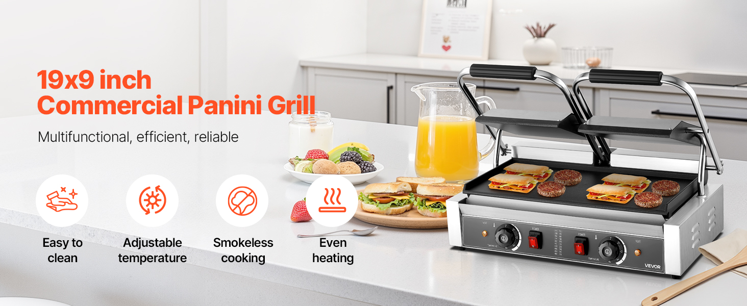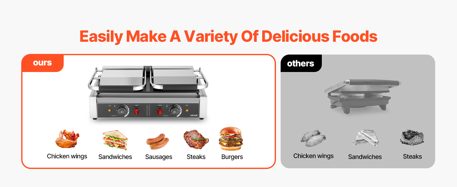 Náš komerčný panini gril dokáže pripraviť viacero potravín, takže je multifunkčný a spĺňa potreby rodinných stretnutí, stánkov s občerstvením, reštaurácií a ďalších zariadení. Ponúka všestranné varenie, pričom jeho kompaktná veľkosť grilu poskytuje dostatočnú plochu na varenie bez toho, aby zaberal veľa miesta na pulte.