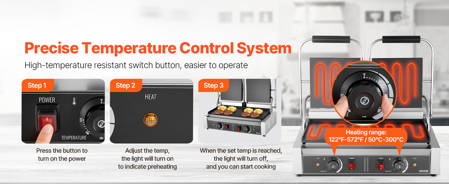 Elektrický sendvičovač panini je navrhnutý s presným systémom regulácie teploty s rozsahom regulácie teploty 122°F-572°F / 50 °C-300 °C. Teplotu si môžete nastaviť podľa svojich potrieb, vďaka čomu je vhodný pre viacerých používateľov.