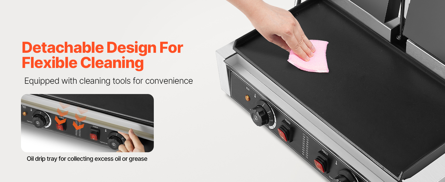 Elektrický sendvičovač z nehrdzavejúcej ocele obsahuje odnímateľný podnos, ktorý zachytáva všetku mastnotu, olej alebo zvyšky, ktoré spadnú z varnej dosky, čo uľahčuje jeho čistenie.