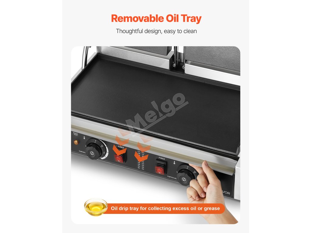 Elektrický sendvičovač z nehrdzavejúcej ocele obsahuje odnímateľný podnos, ktorý zachytáva všetku mastnotu, olej alebo zvyšky, ktoré spadnú z varnej dosky, čo uľahčuje jeho čistenie.