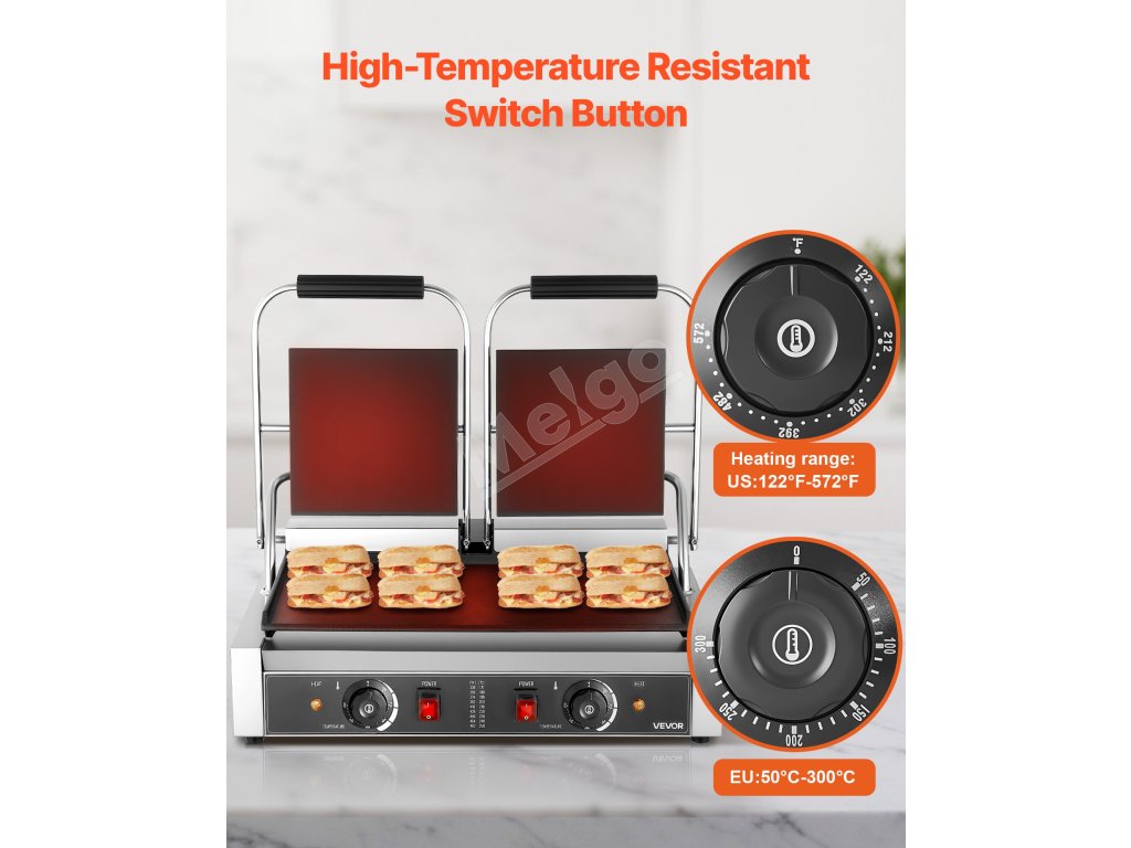 Elektrický sendvičovač panini je navrhnutý s presným systémom regulácie teploty s rozsahom regulácie teploty 122°F-572°F / 50 °C-300 °C. Teplotu si môžete nastaviť podľa svojich potrieb, vďaka čomu je vhodný pre viacerých používateľov.