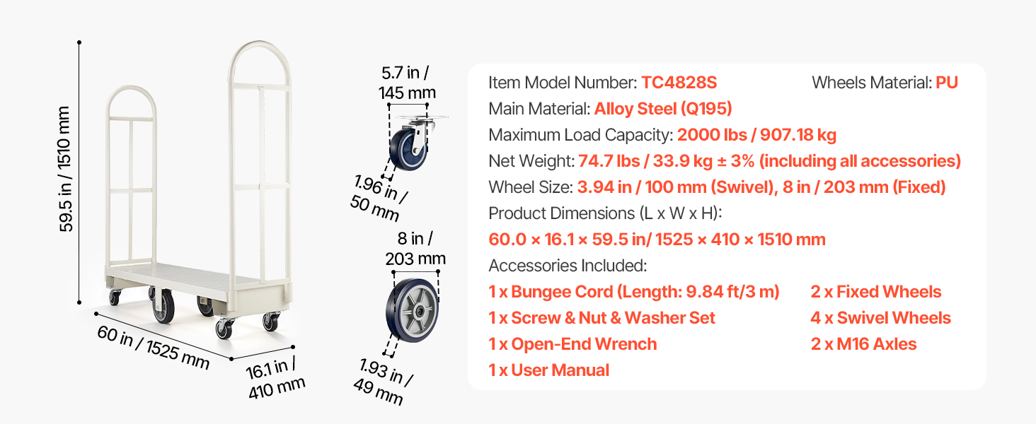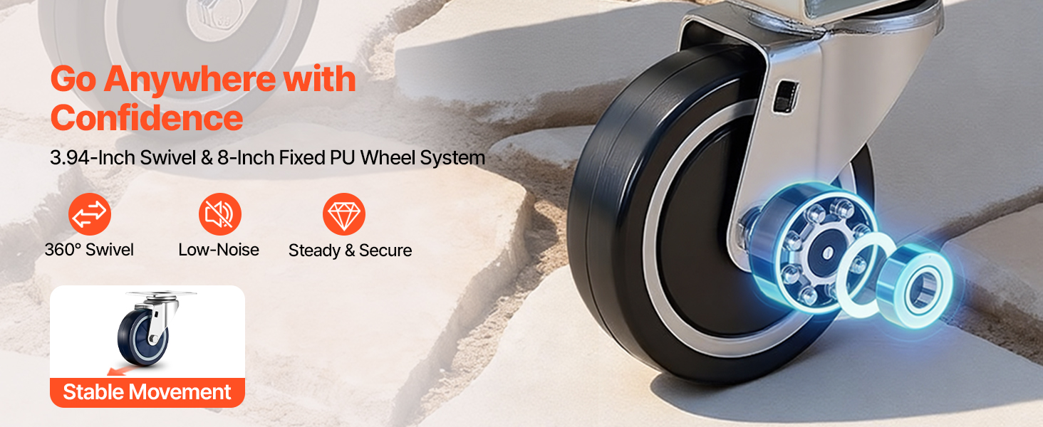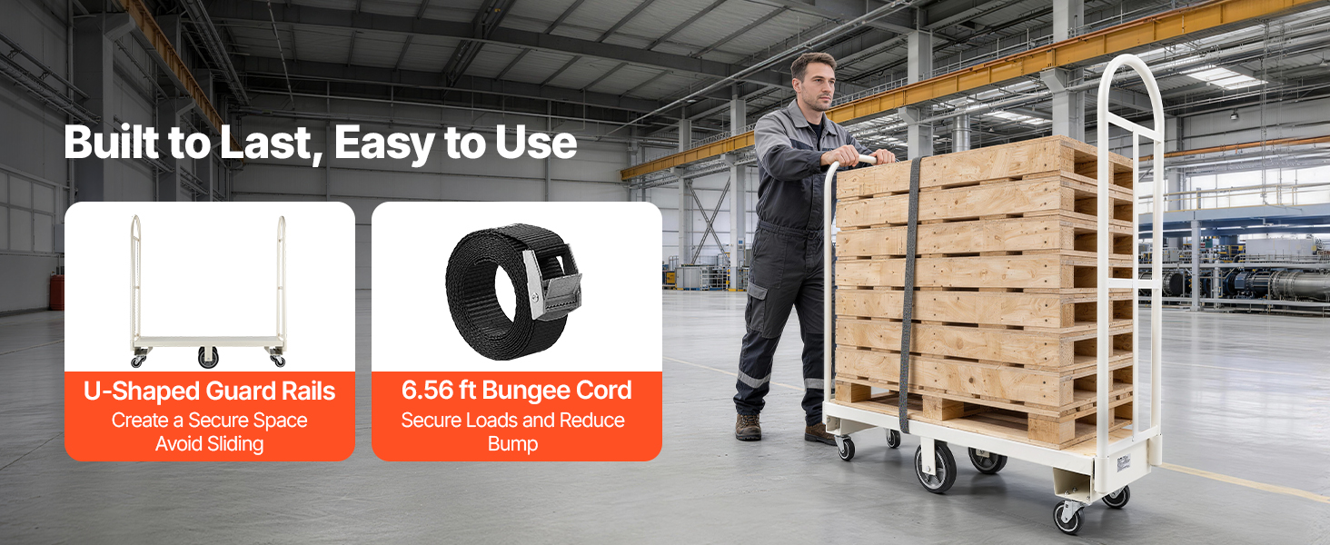 Vybavený veľkými otočnými a pevnými kolesami, tento vozík s plochou ložnou plochou poskytuje plynulý a flexibilný pohyb. Aj pri plnom zaťažení sa ľahko kĺže, čo pomáha znížiť vašu námahu pri dlhých prevozoch.