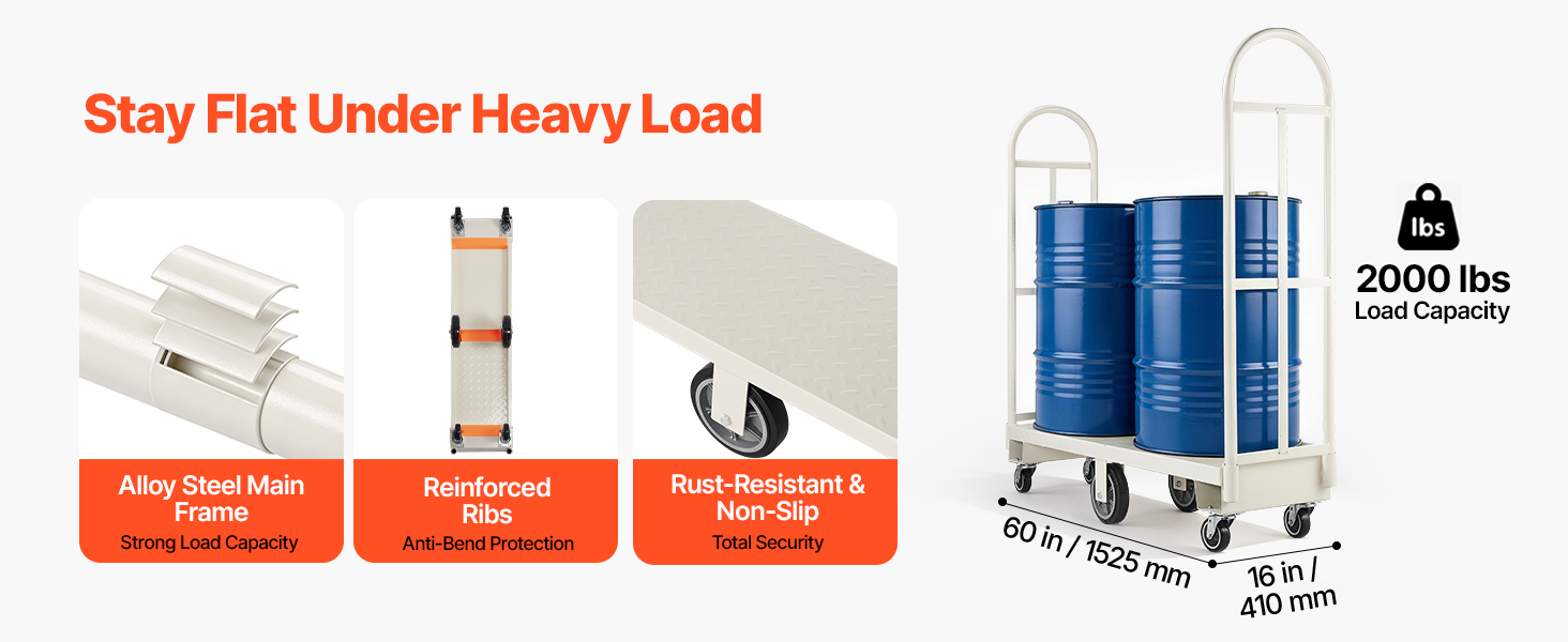 Tento ťažký plošinový vozík má posilnený rám z legovanej ocele a hrubú základňu, vďaka čomu je mimoriadne odolný. Aj pri opakovanom ťažkom zaťažení odoláva ohybu, deformácii a dlhodobému opotrebeniu.