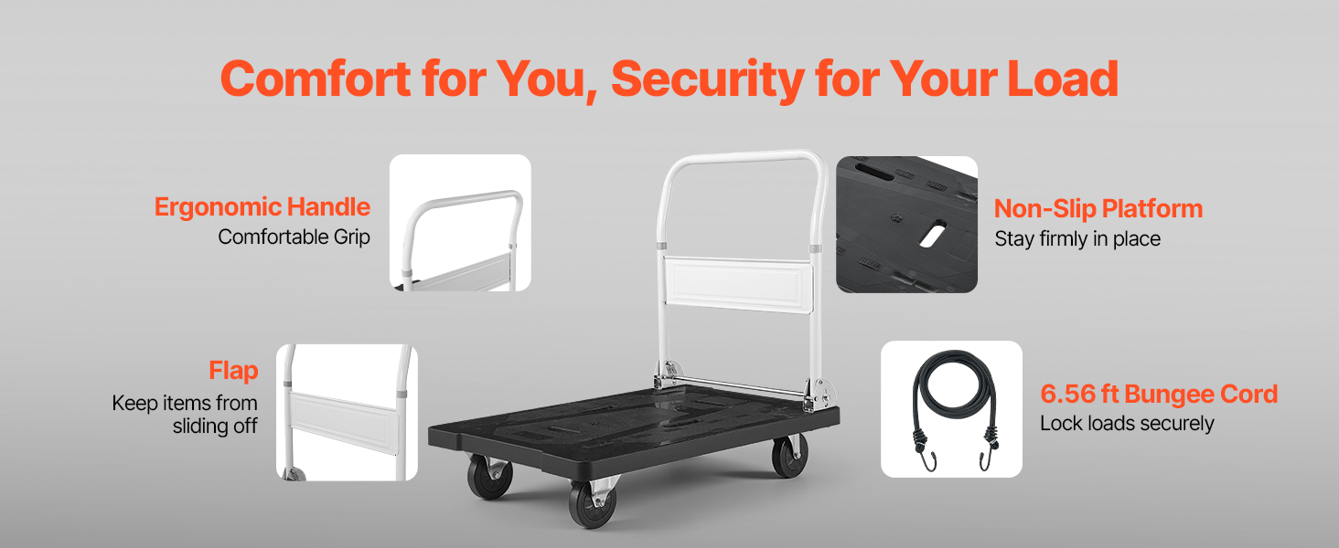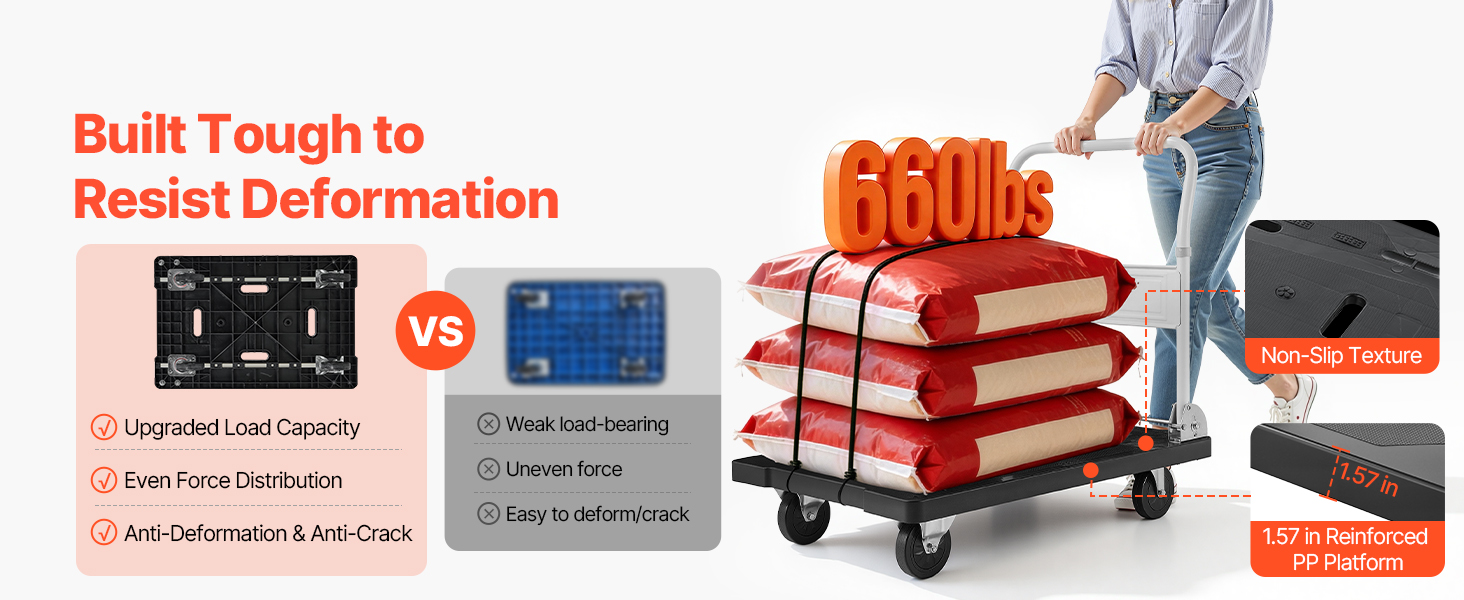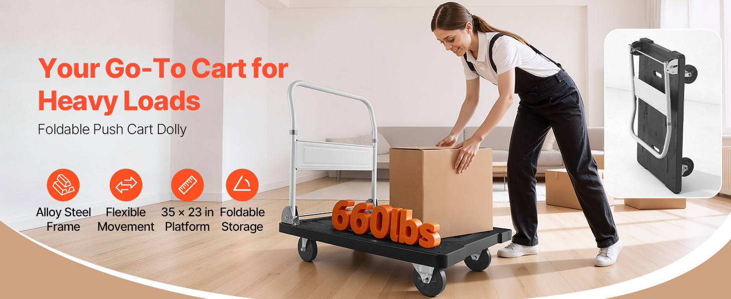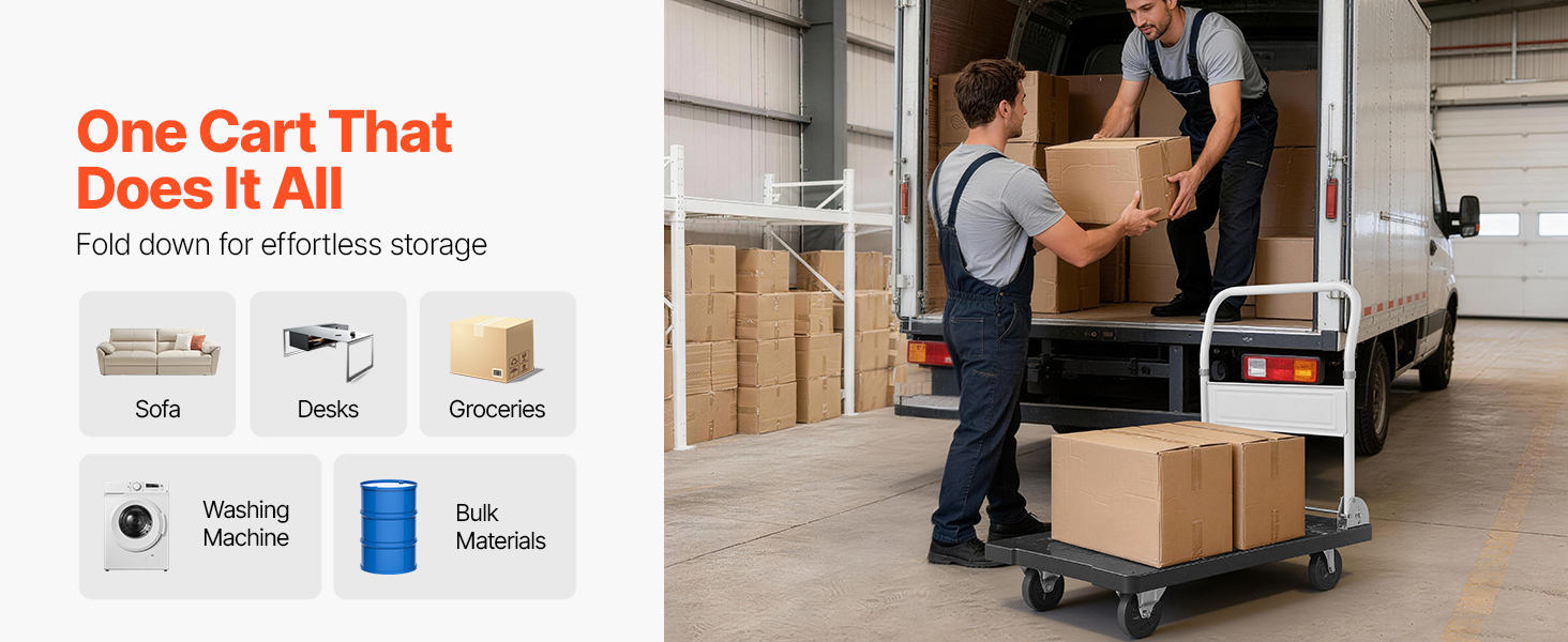 Od domácich prác a doplňovania zásob v obchode až po presun kancelárskeho vybavenia, tento skladací vozík s plochou ložnou plochou a kolieskami zvládne všetko. Jeden vozík pokryje viac úloh s menšou námahou.